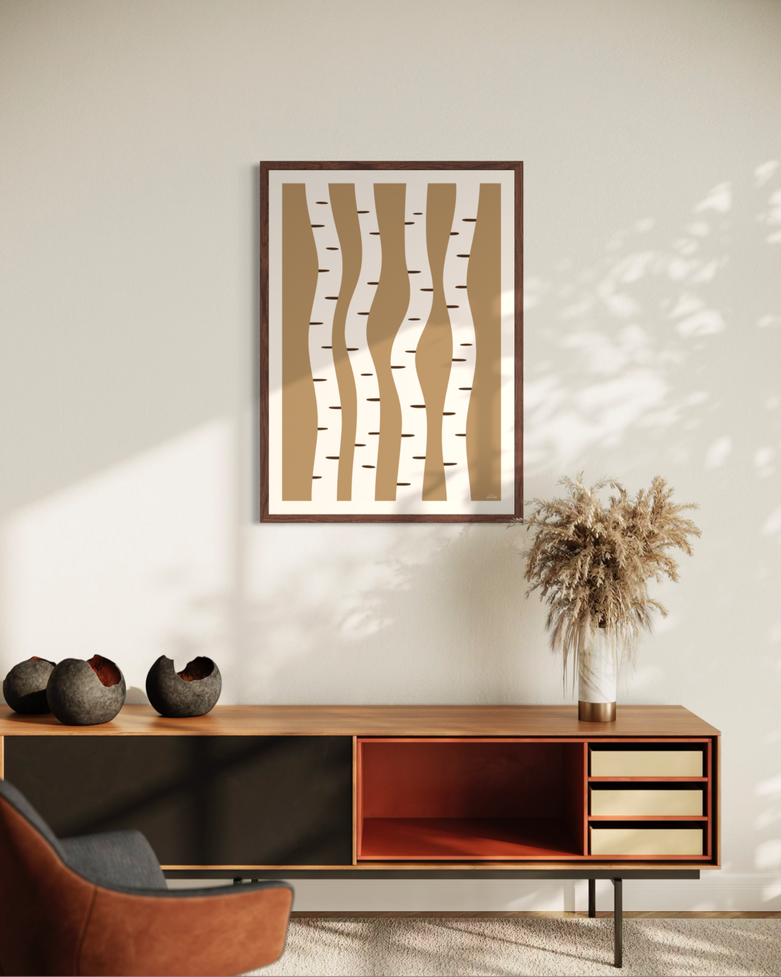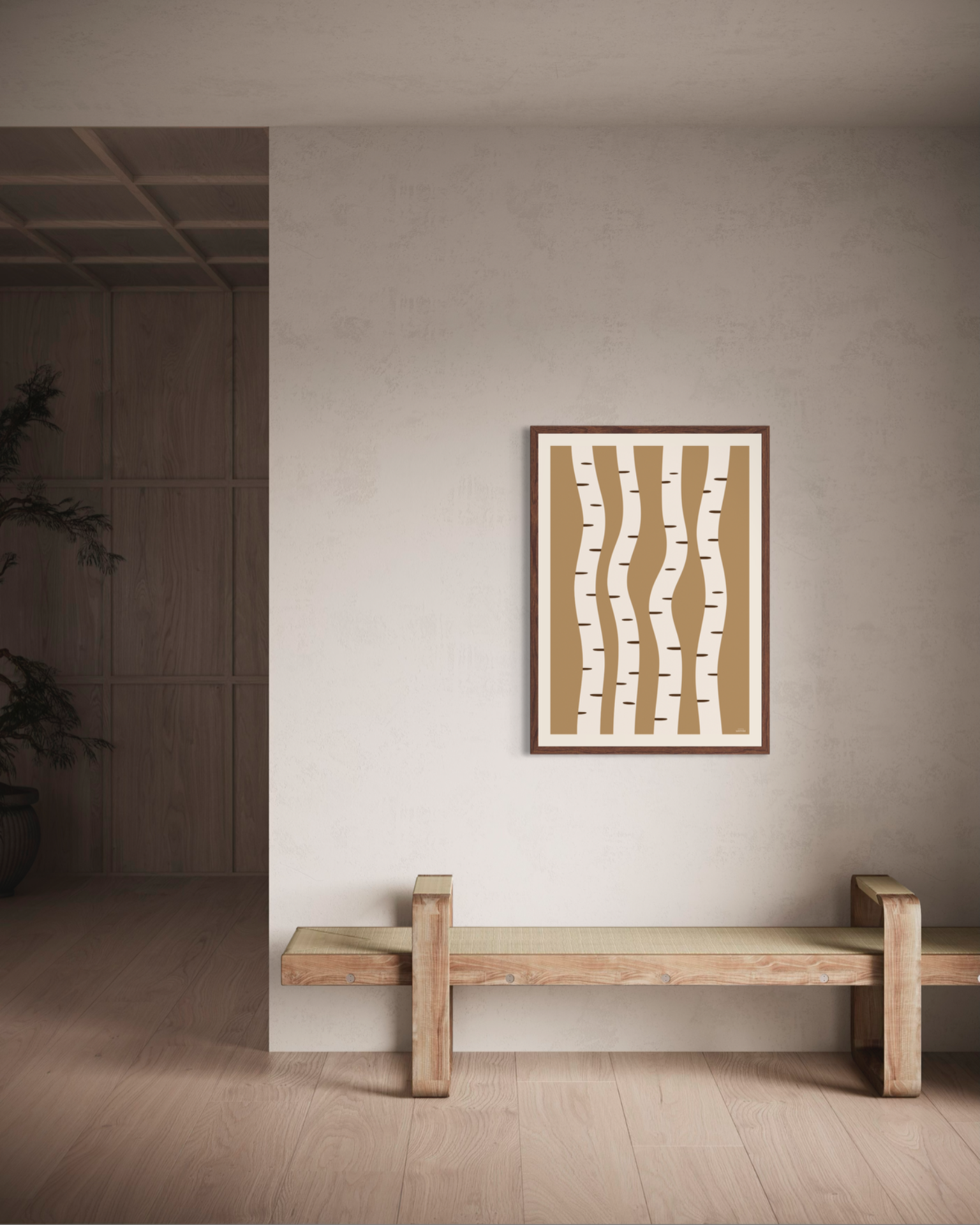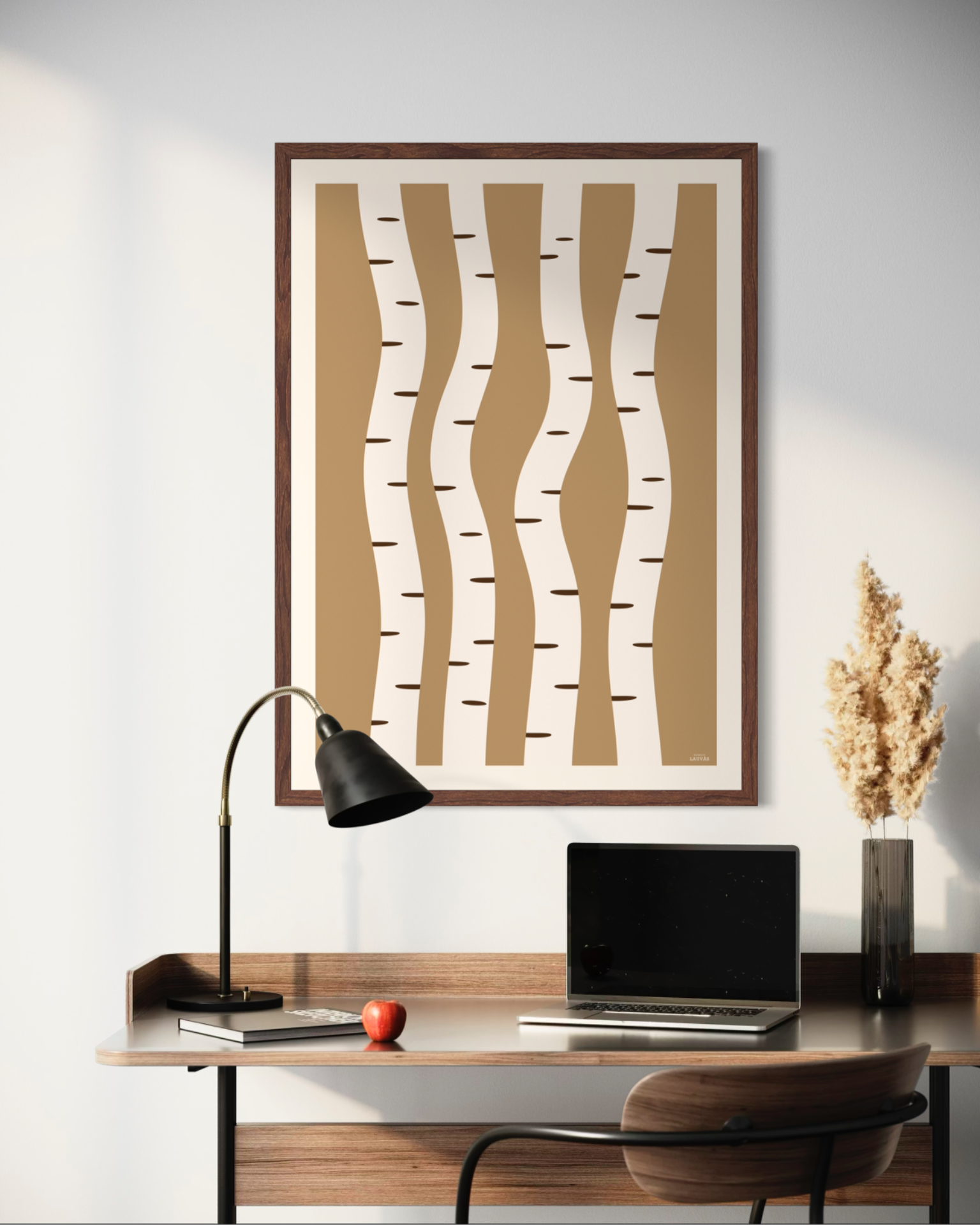 Et stilrent og grafisk motiv inspirert av bjørkestammer og naturens repeterende former. De myke linjene og varme, dempede fargetonene gir et rolig og balansert uttrykk som passer godt inn i nordisk interiør. Et tidløst motiv som fungerer like fint alene som i kombinasjon med andre plakater.