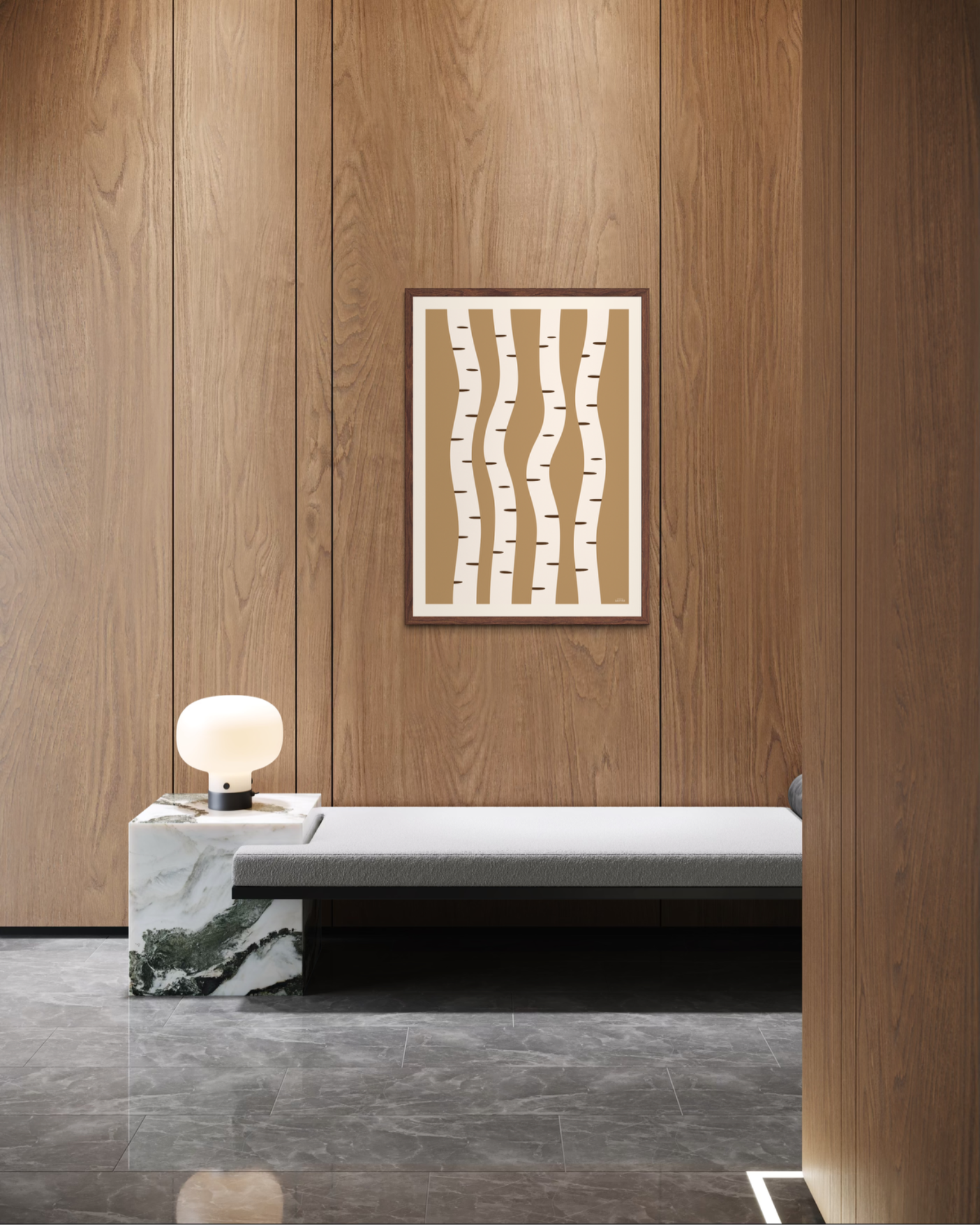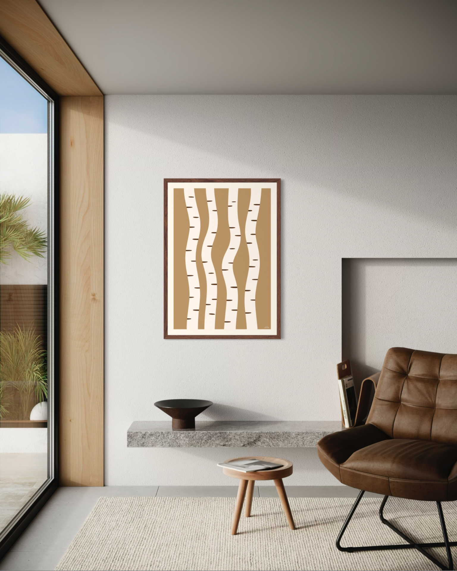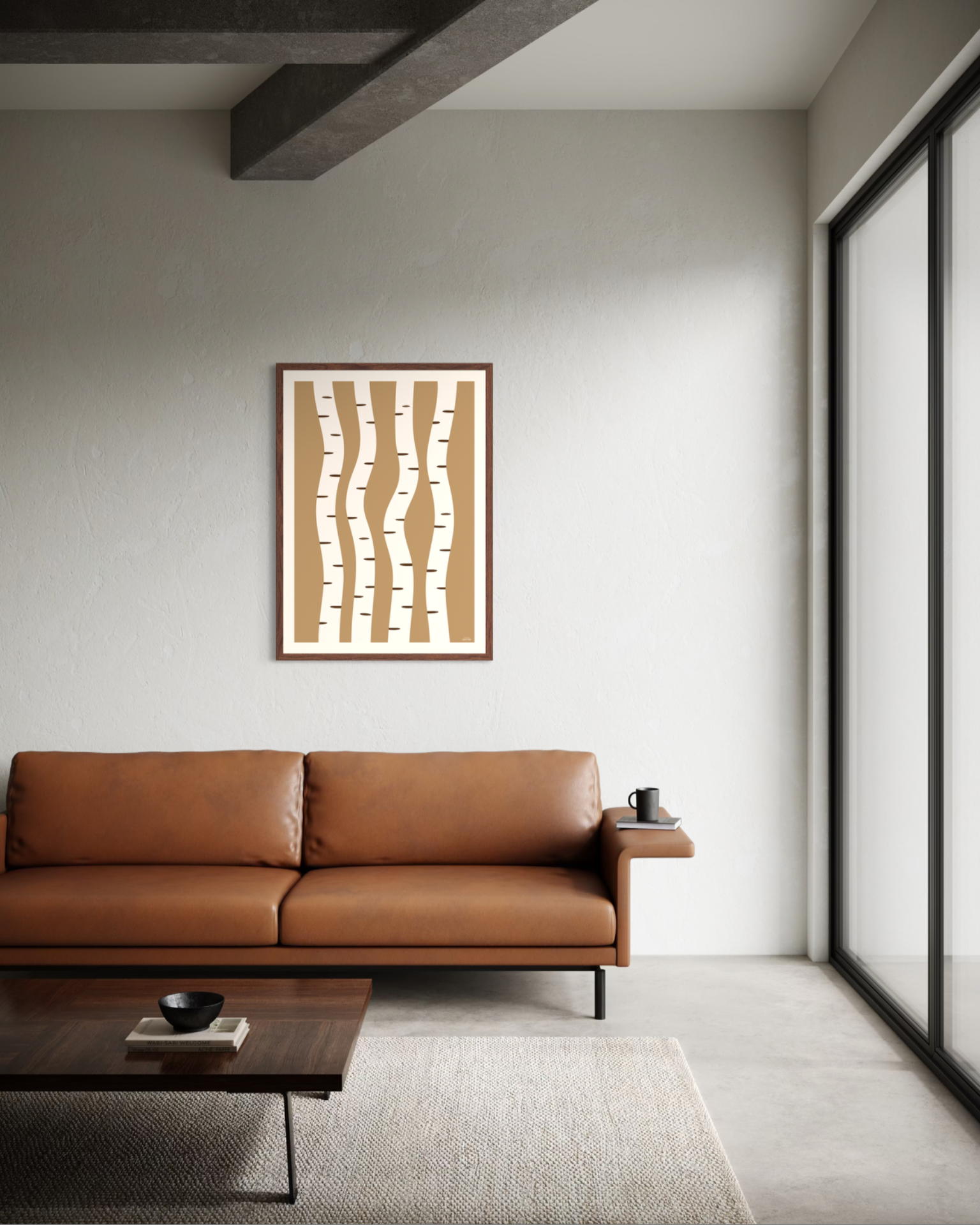 Et stilrent og grafisk motiv inspirert av bjørkestammer og naturens repeterende former. De myke linjene og varme, dempede fargetonene gir et rolig og balansert uttrykk som passer godt inn i nordisk interiør. Et tidløst motiv som fungerer like fint alene som i kombinasjon med andre plakater.