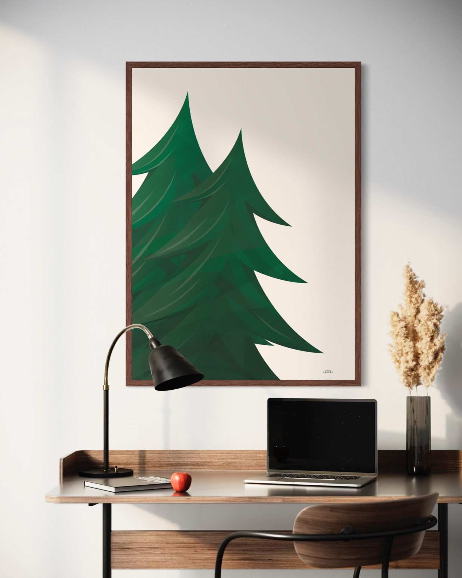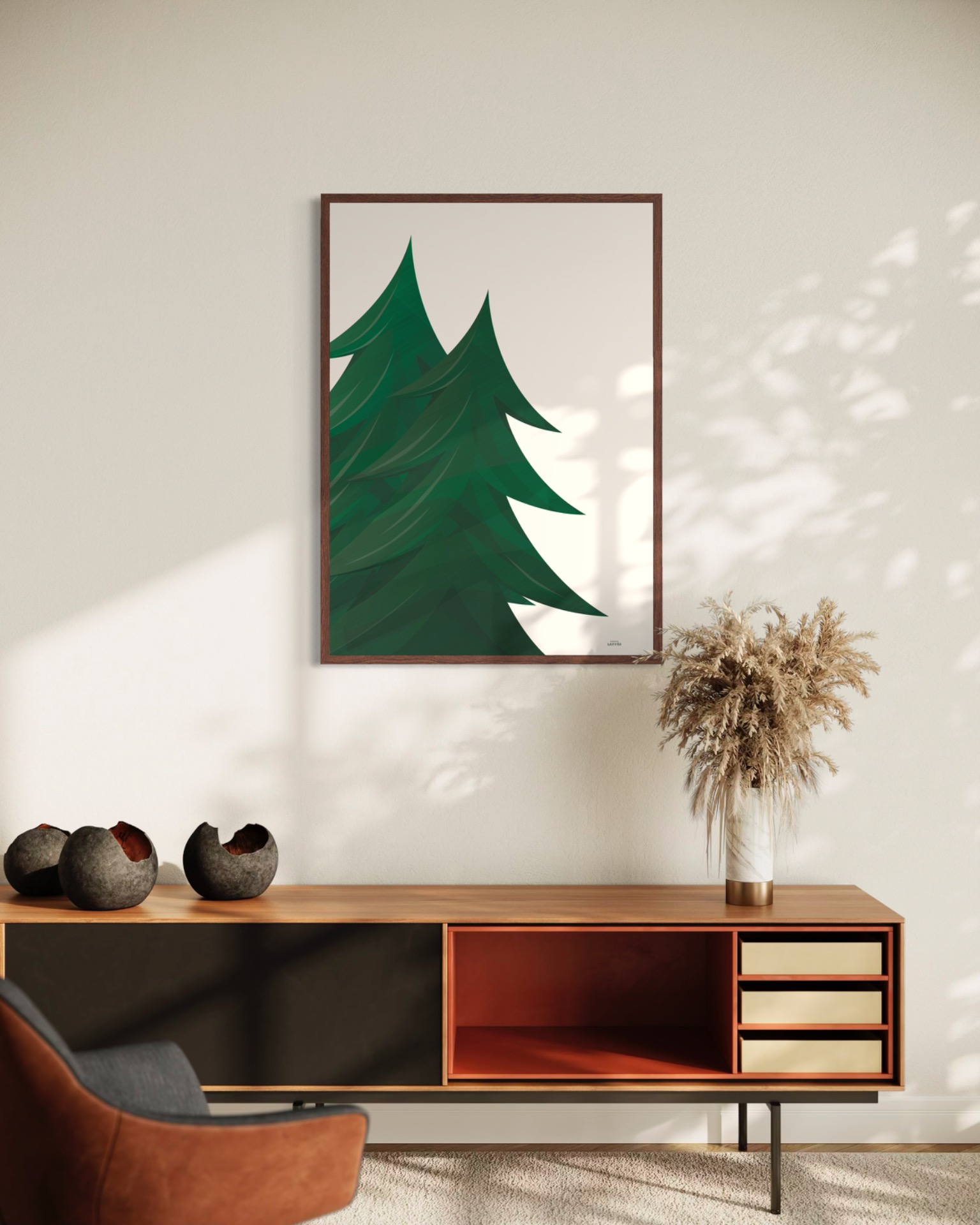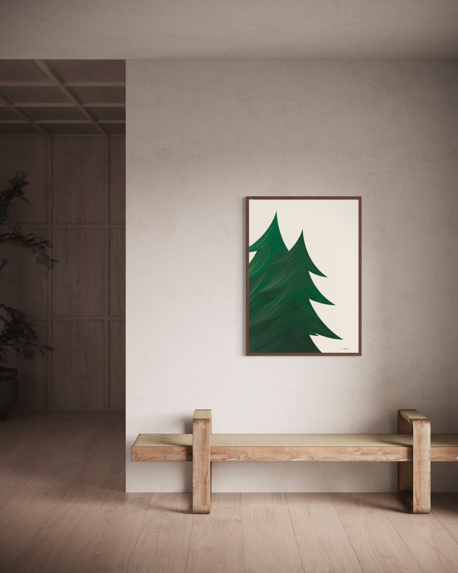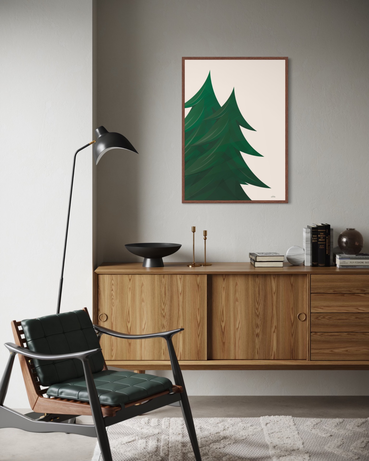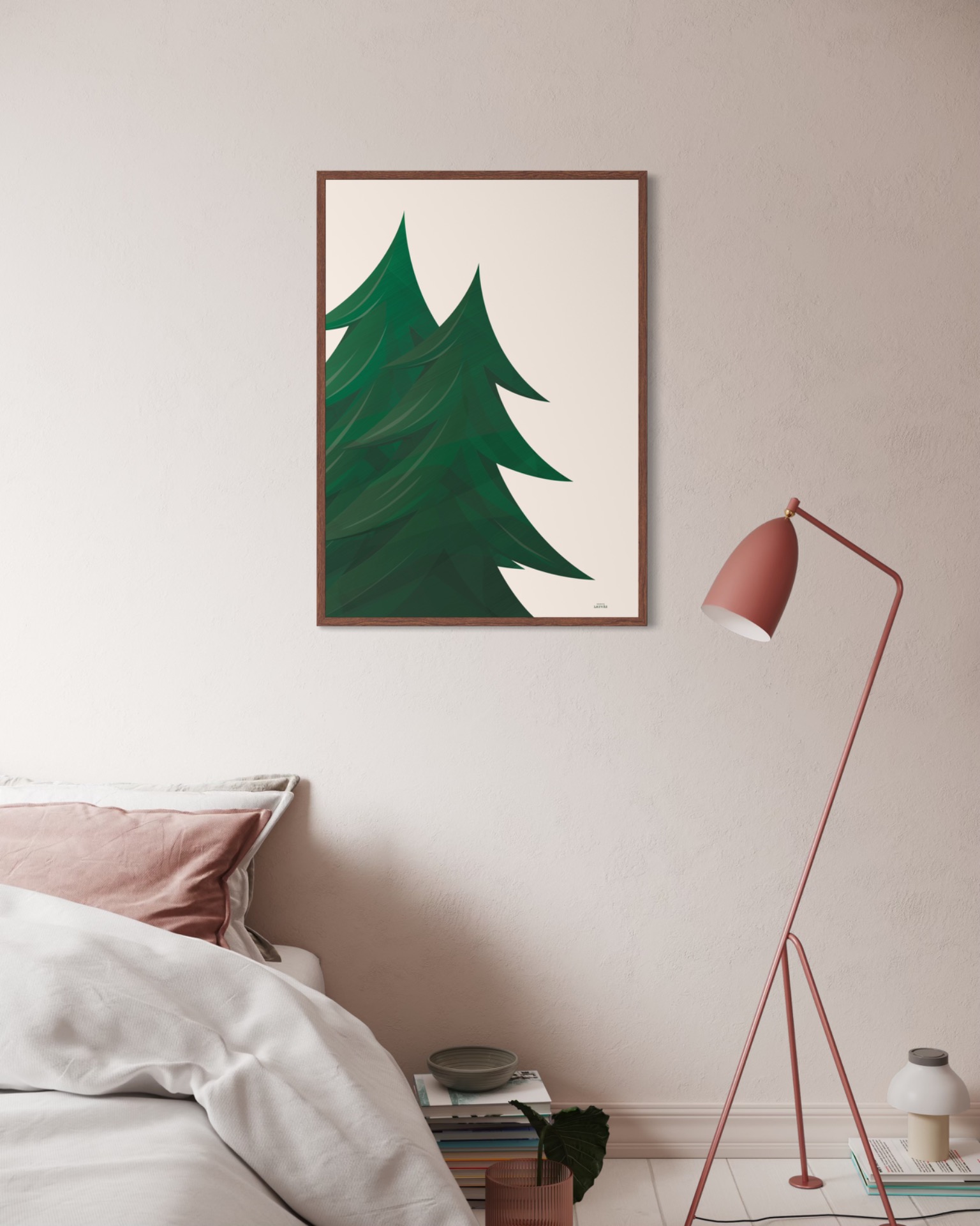 Grana står som et ikon for nordisk ro, natur og balanse – og har de siste årene blitt et symbol på moderne minimalisme innen skandinavisk design. I denne plakaten har jeg tolket grantrærne med rene, myke linjer og lagvise grønnnyanser som gir dybde uten å miste enkelheten. Perfekt dersom du ønsker å ta naturen inn i interiøret ditt, og tilføre interiøret en herlig dyp grønntone.