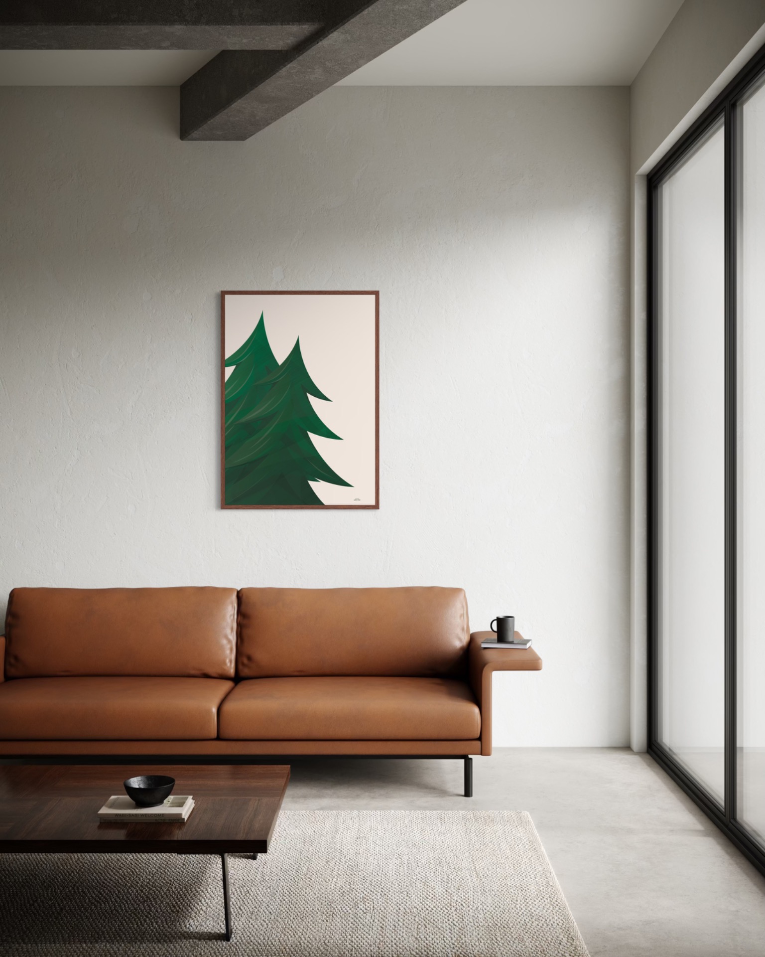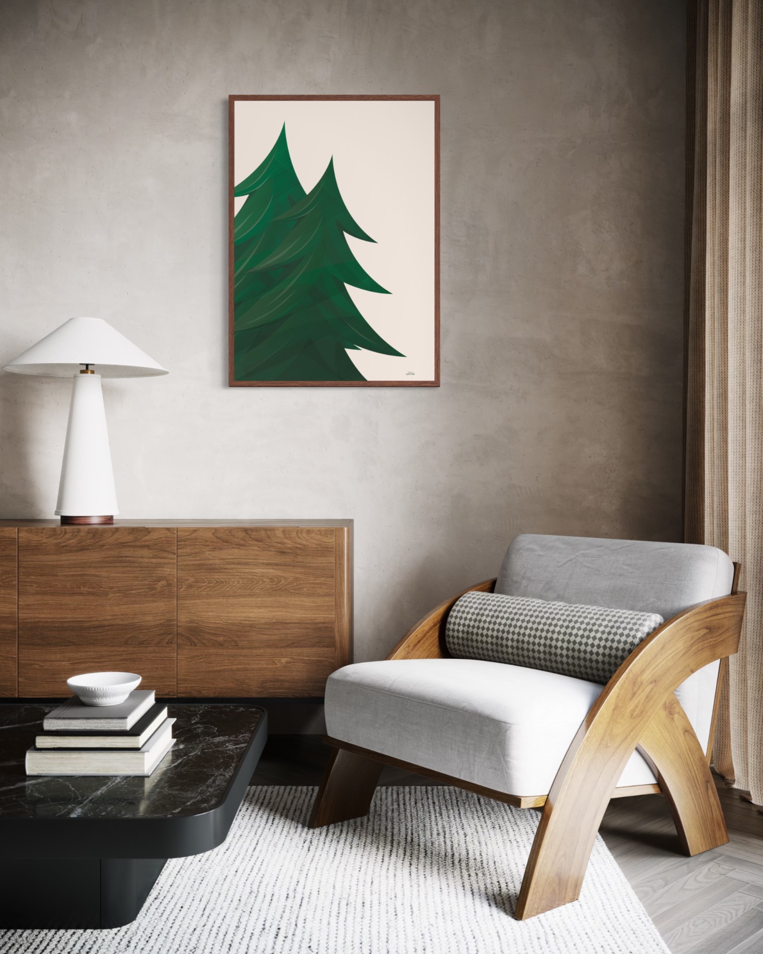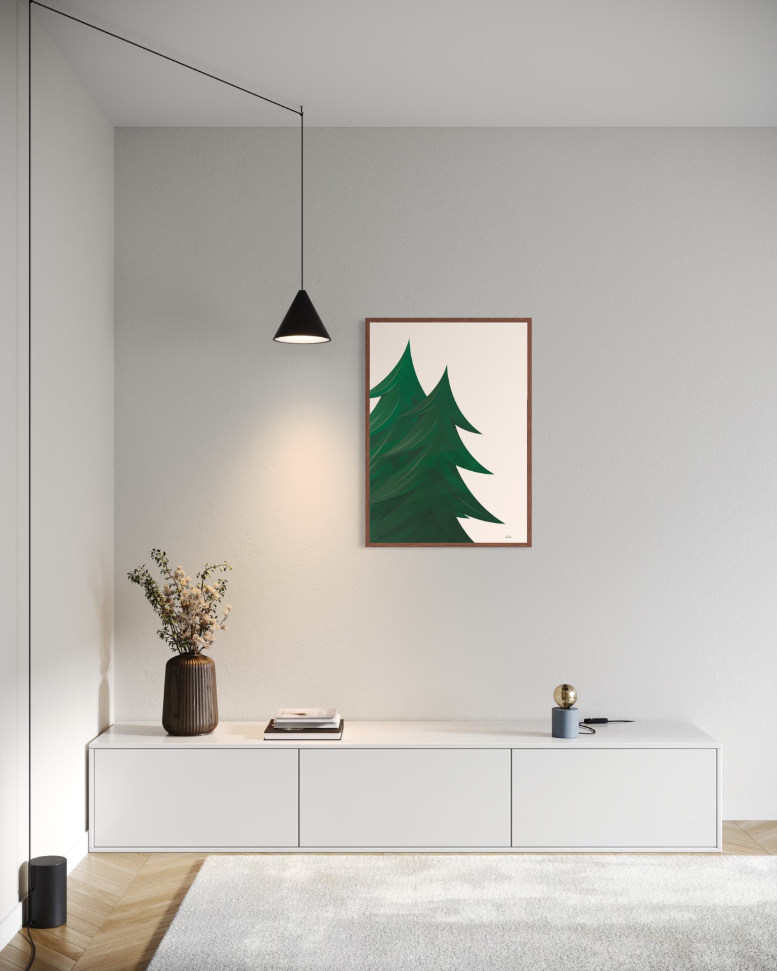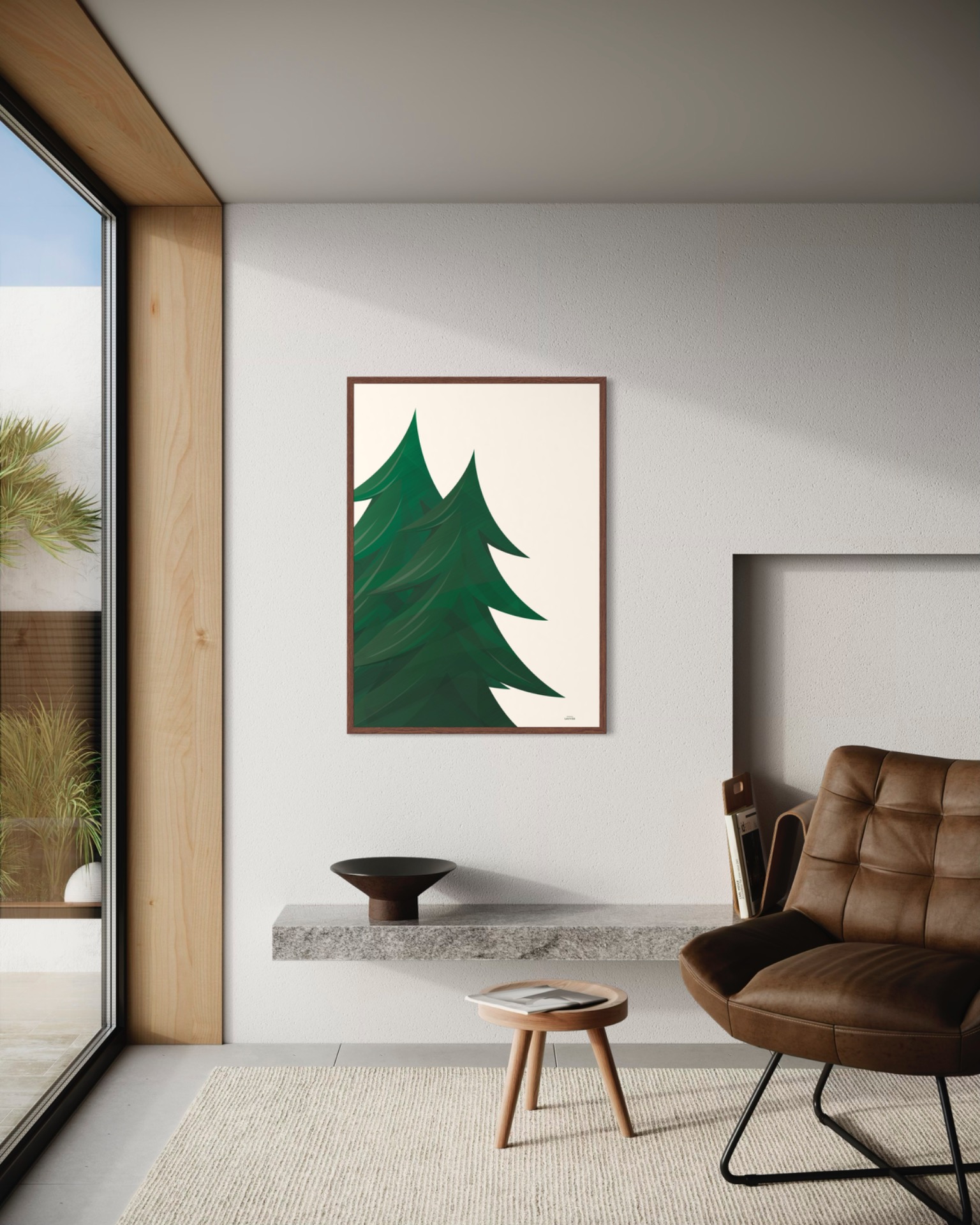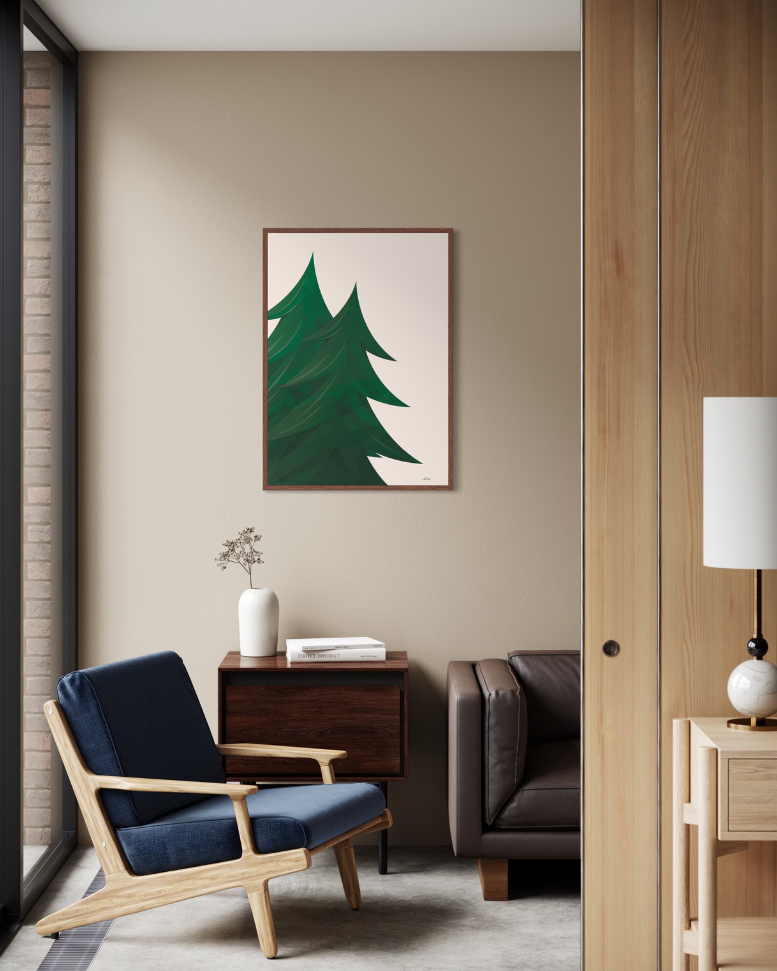 Grana står som et ikon for nordisk ro, natur og balanse – og har de siste årene blitt et symbol på moderne minimalisme innen skandinavisk design. I denne plakaten har jeg tolket grantrærne med rene, myke linjer og lagvise grønnnyanser som gir dybde uten å miste enkelheten. Perfekt dersom du ønsker å ta naturen inn i interiøret ditt, og tilføre interiøret en herlig dyp grønntone.