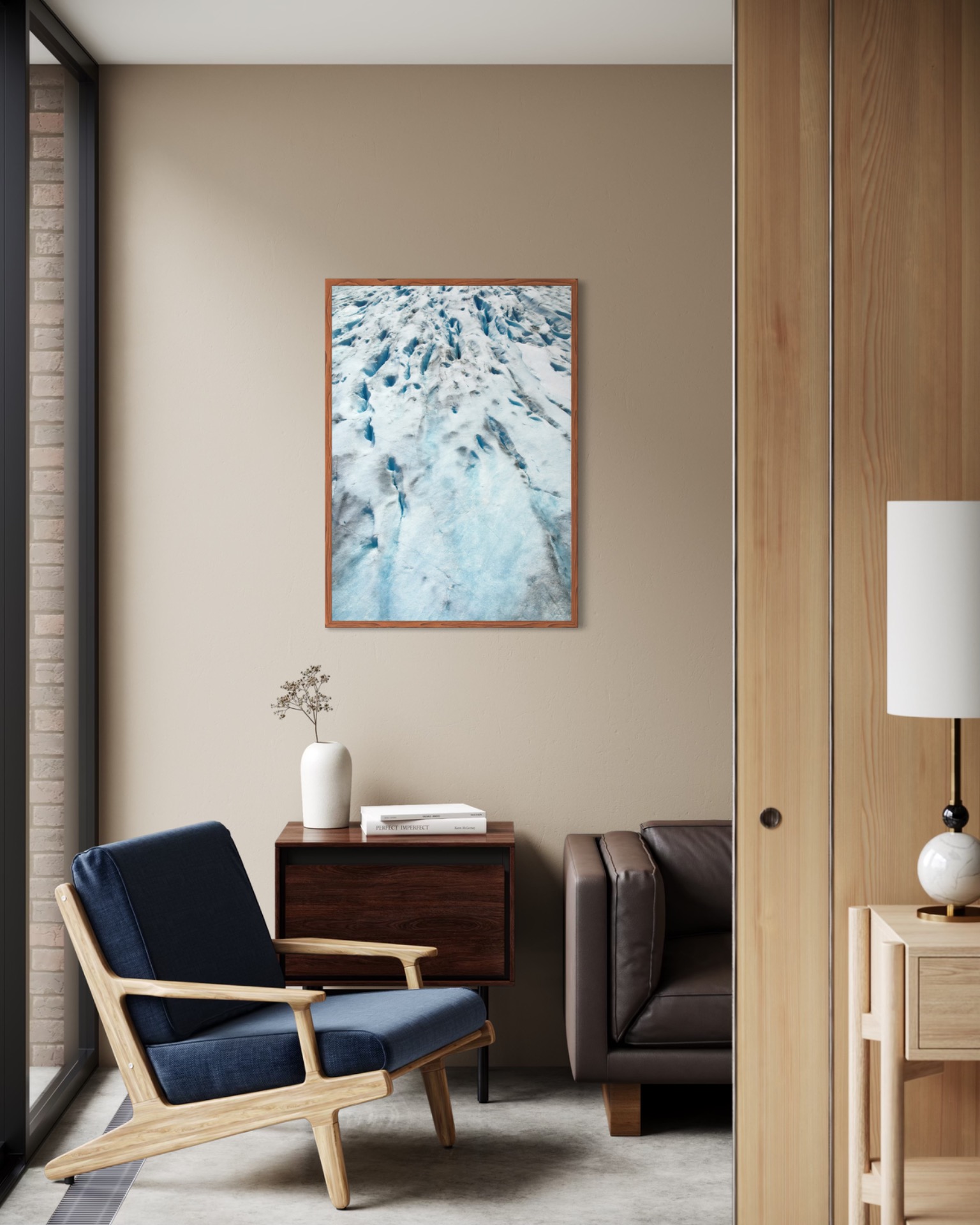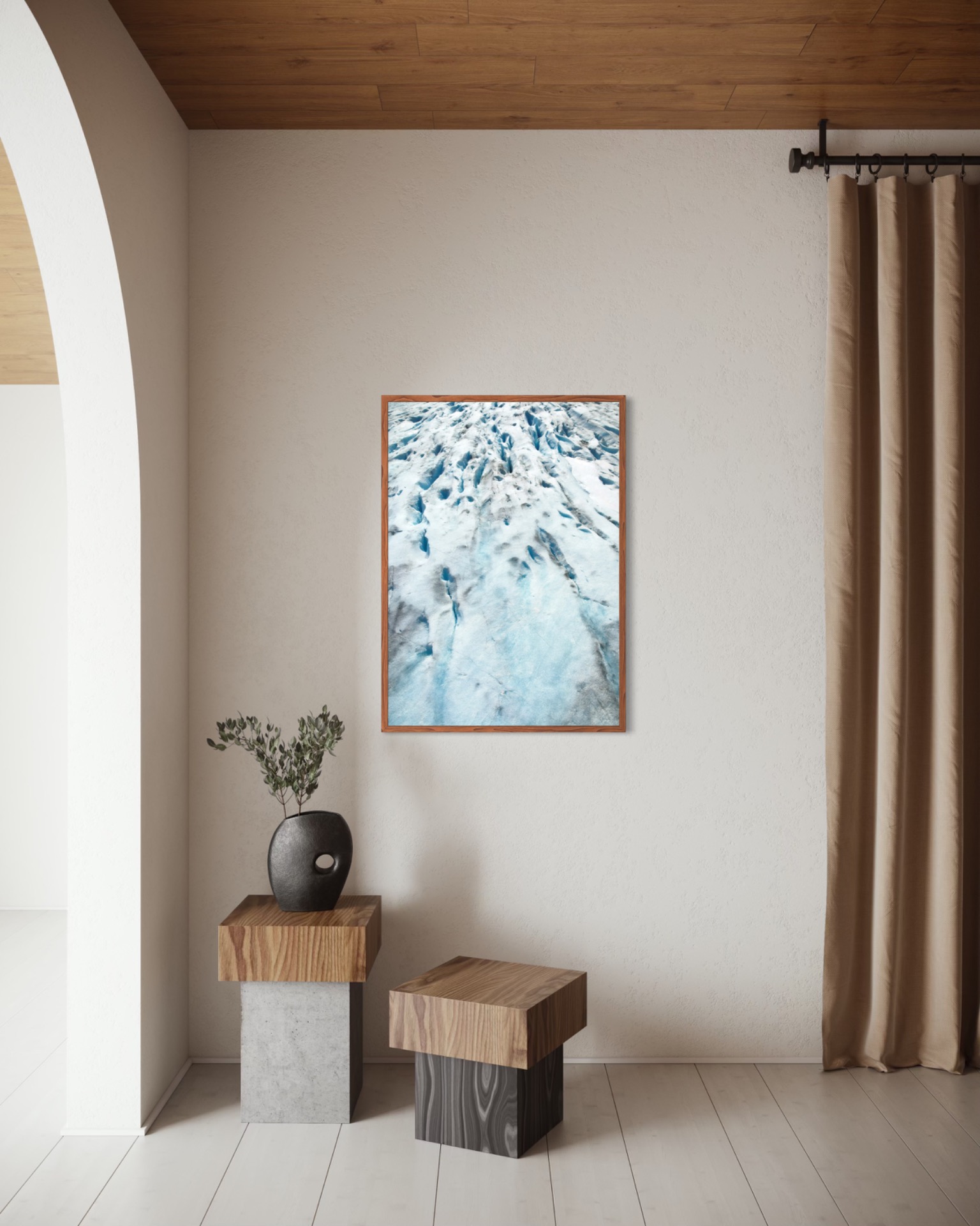Fra luften trer Okstindbreen frem som et landskap av is i bevegelse – et nett av dype sprekker, blå iskanter og organiske linjer formet av tid og naturkrefter. Dette dronebildet fanger den rå energien i en av Norges mest imponerende breer, sett ovenfra der mønstrene blir både kunstneriske og monumentale.