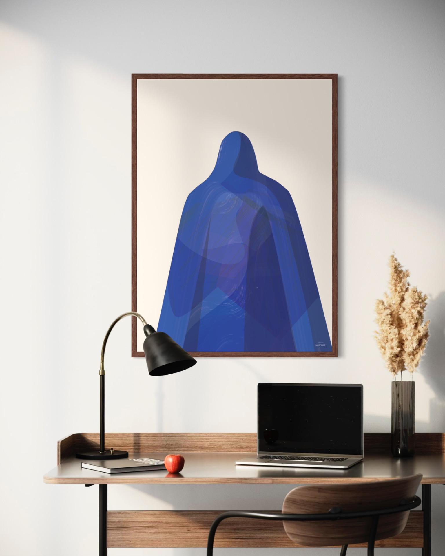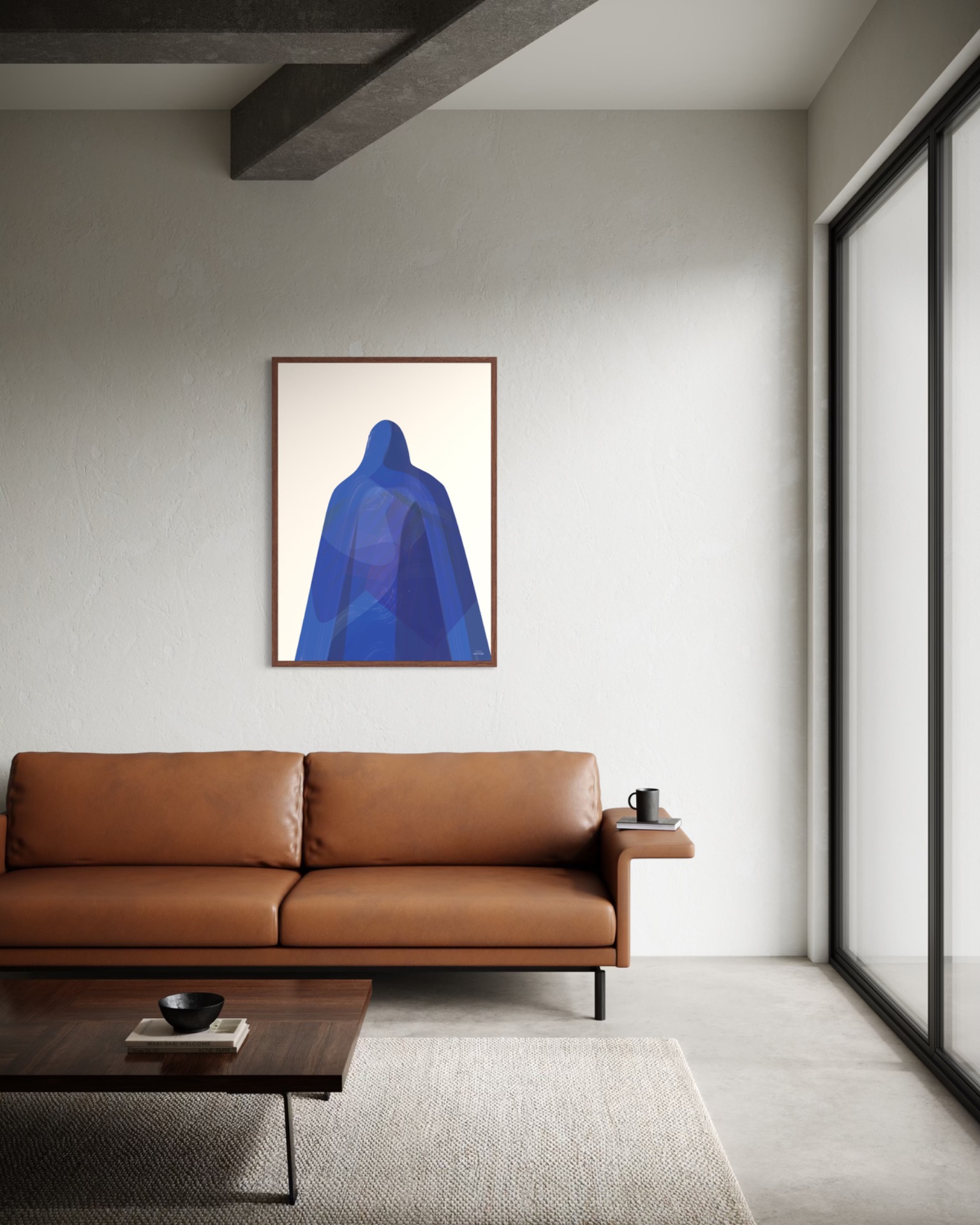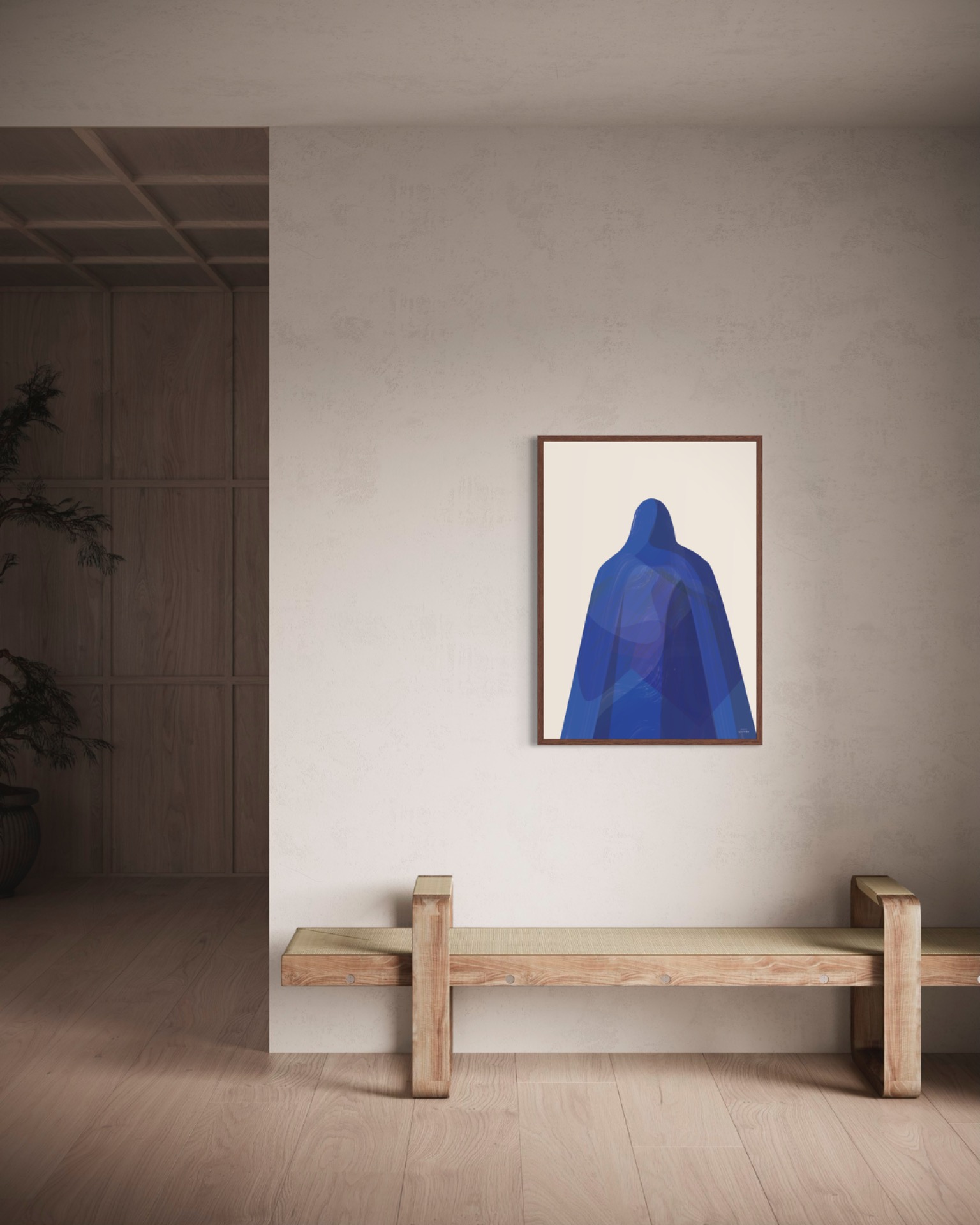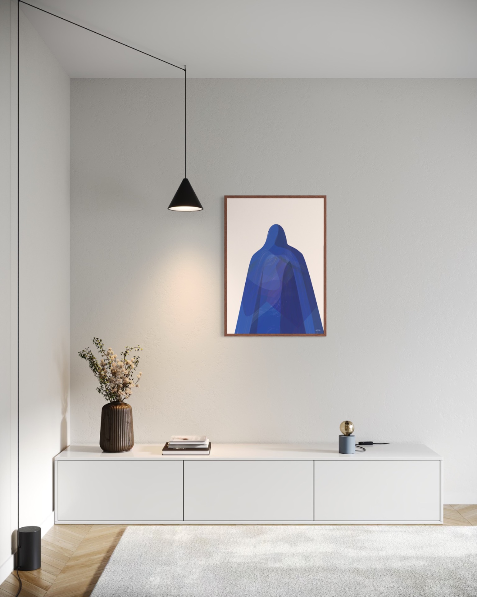 «Skygge» er et uttrykk for ro og tilstedeværelse – et stille portrett av form og lys. De dype blåtonene og de transparente lagene er ment å skape følelse av dybde der det fysiske møter det abstrakte. Motivet inviterer til ro og refleksjon, og passer perfekt i rom der man ønsker et kunstnerisk fokuspunkt uten støy.
