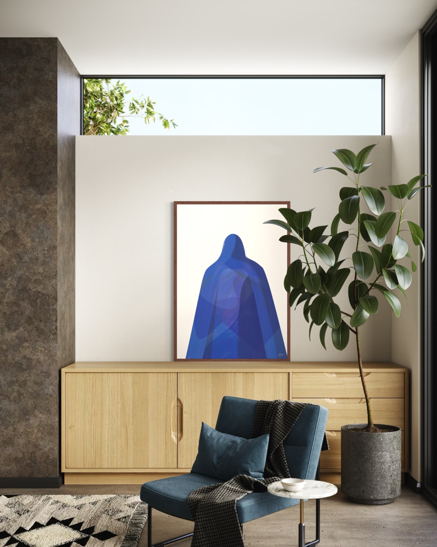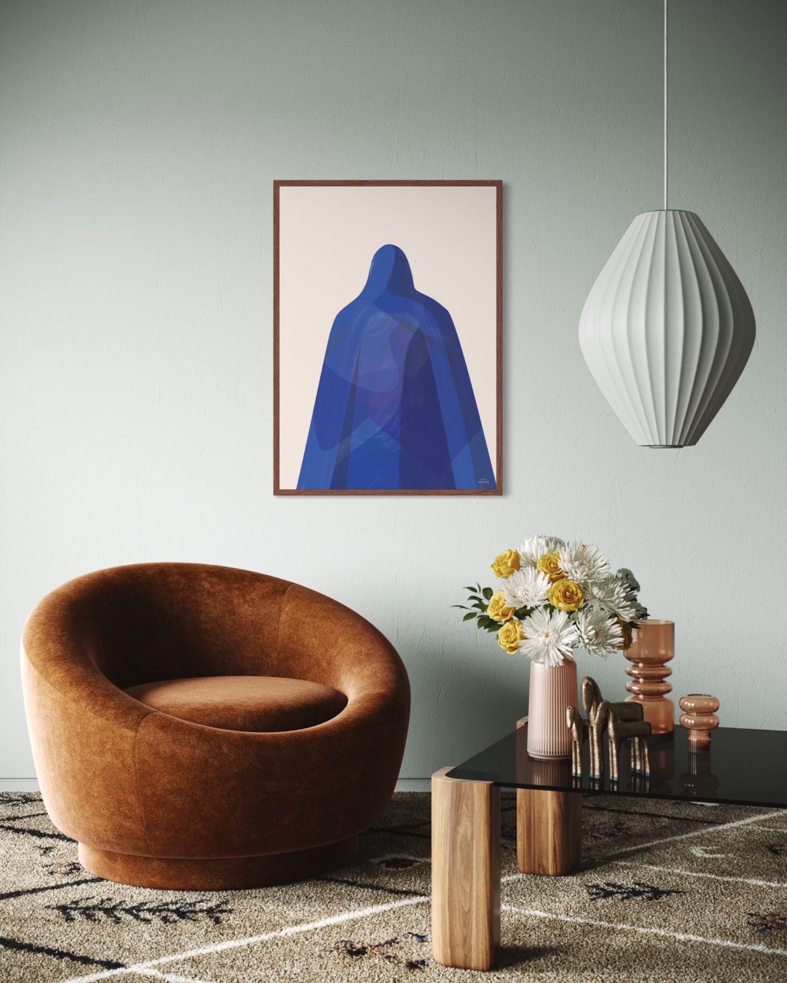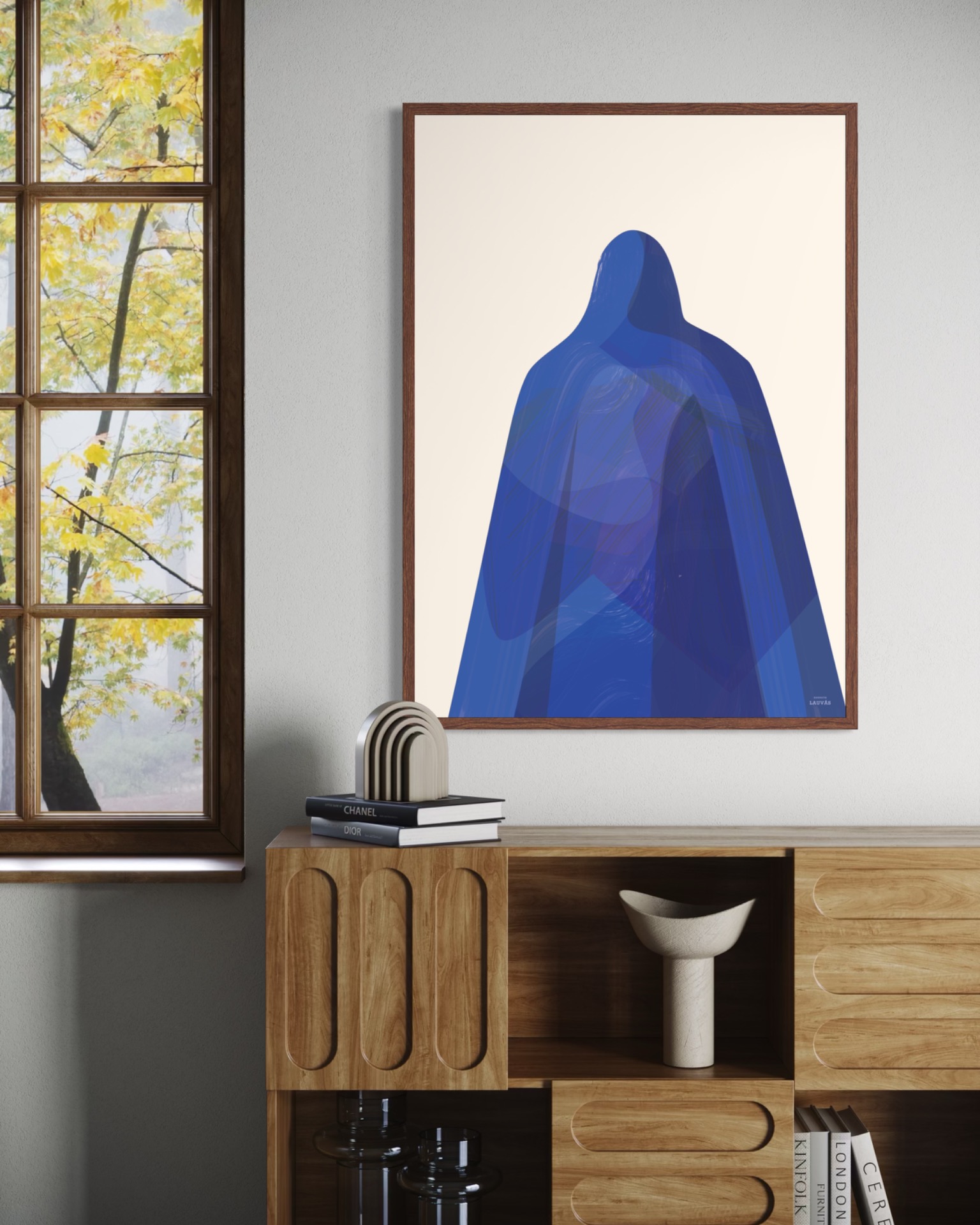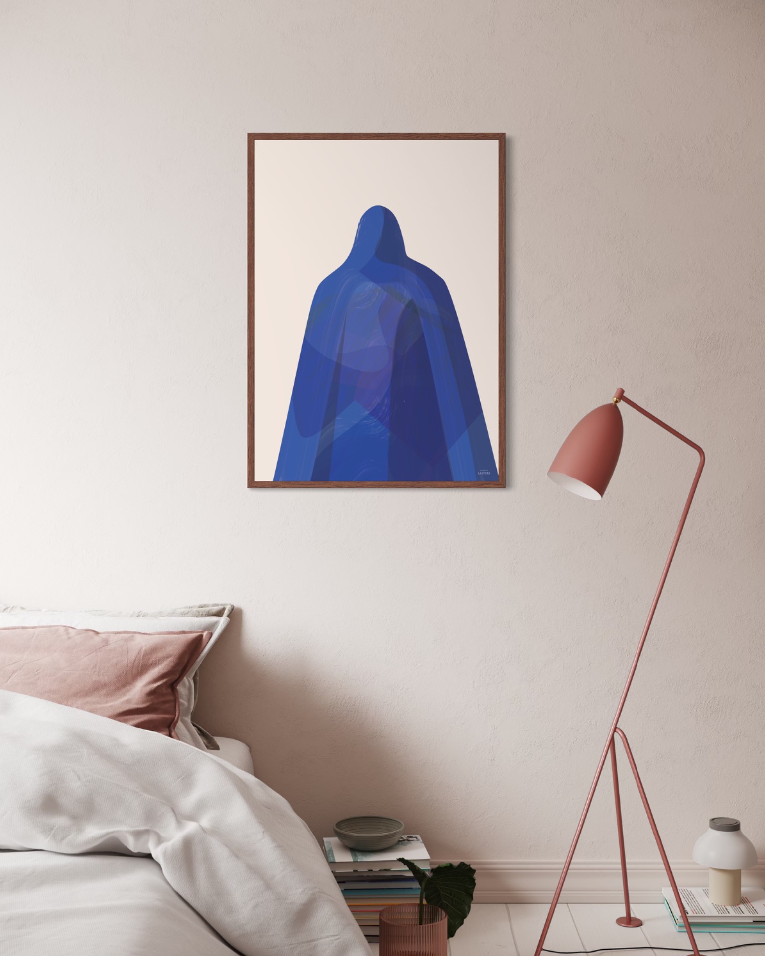 «Skygge» er et uttrykk for ro og tilstedeværelse – et stille portrett av form og lys. De dype blåtonene og de transparente lagene er ment å skape følelse av dybde der det fysiske møter det abstrakte. Motivet inviterer til ro og refleksjon, og passer perfekt i rom der man ønsker et kunstnerisk fokuspunkt uten støy.