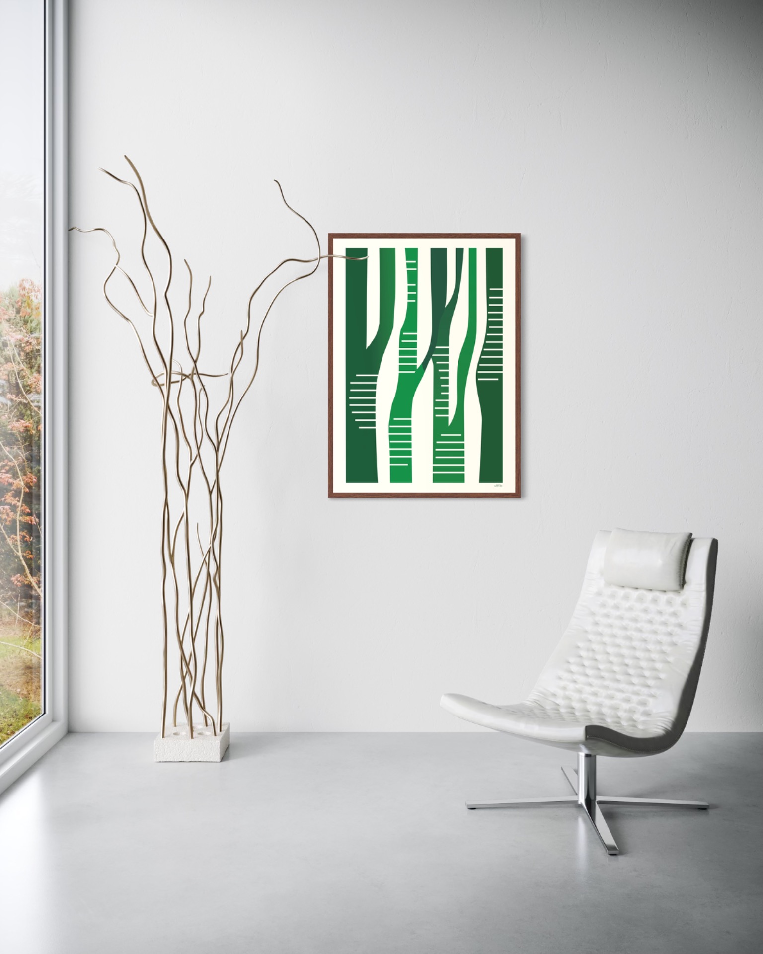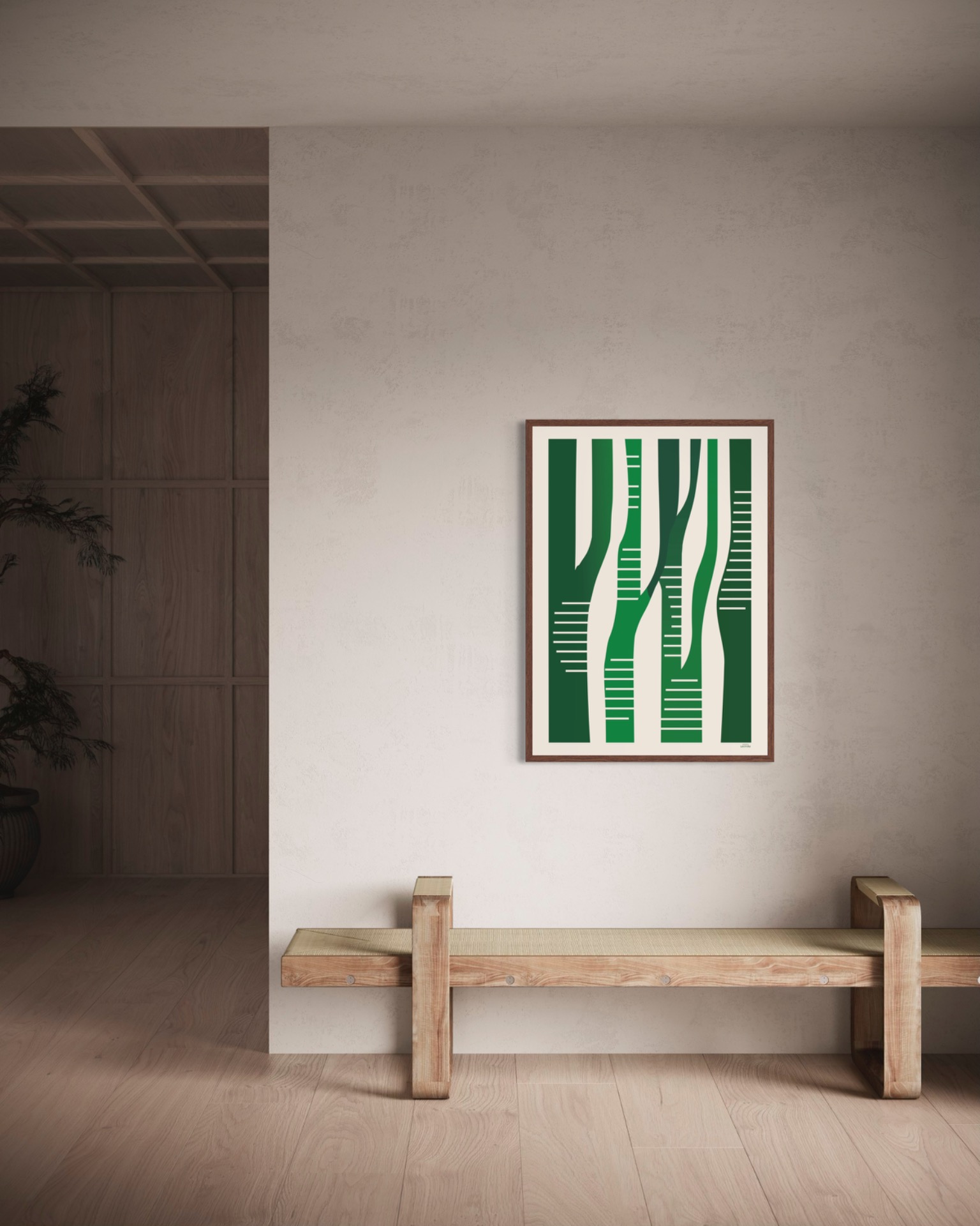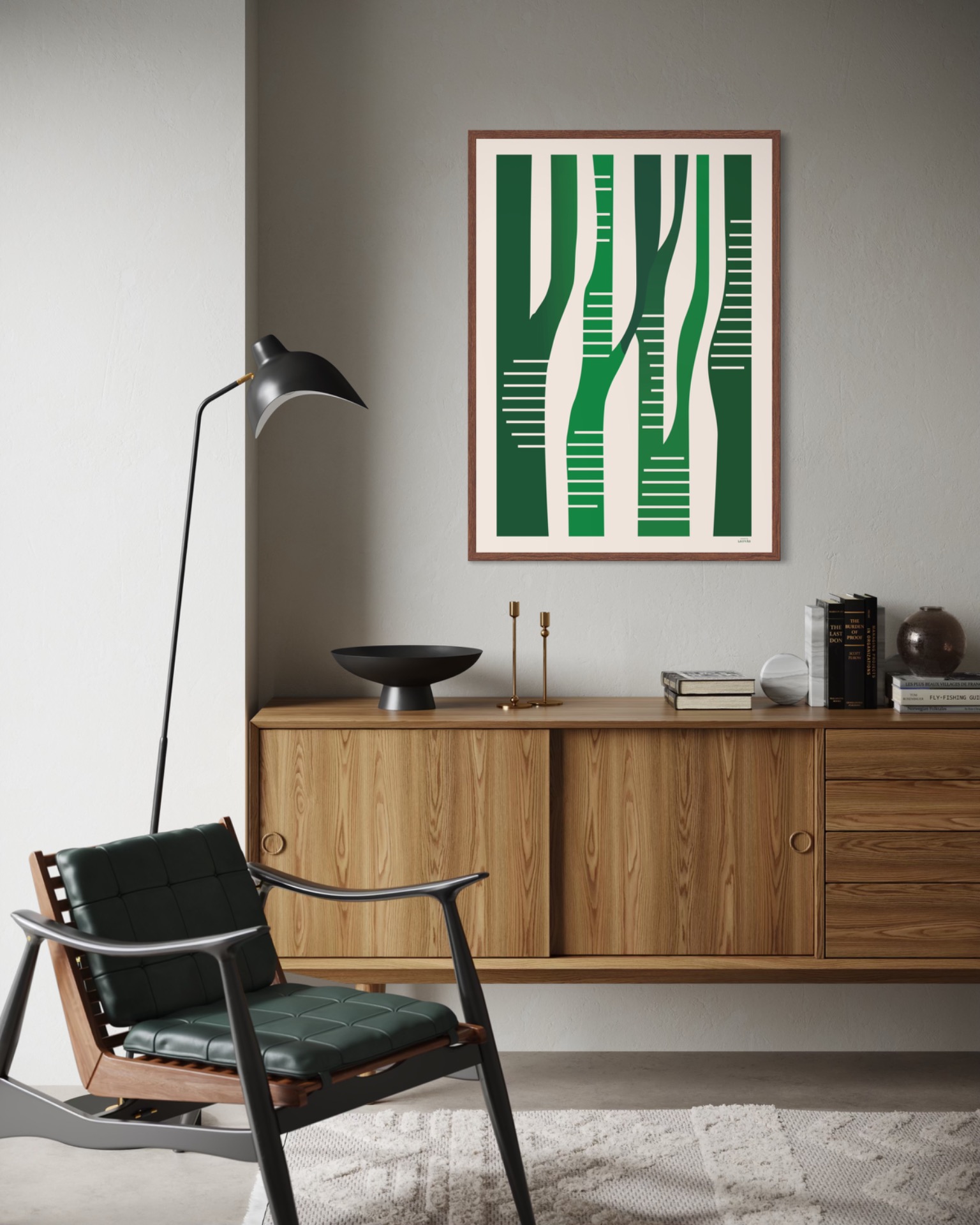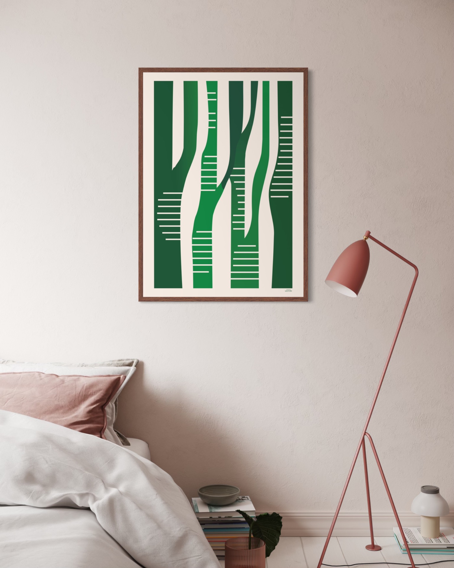 "The Wood" er min hyllest til naturen og er ment å fremkalle følelsen av å bevege seg mellom trær og simulerer skogens rytme og bevegelse. Plakaten er tegnet med mål om å passe inn i et minimalistisk interiør med myke linjer og grønne nyanser skaper en rolig balanse mellom natur og form