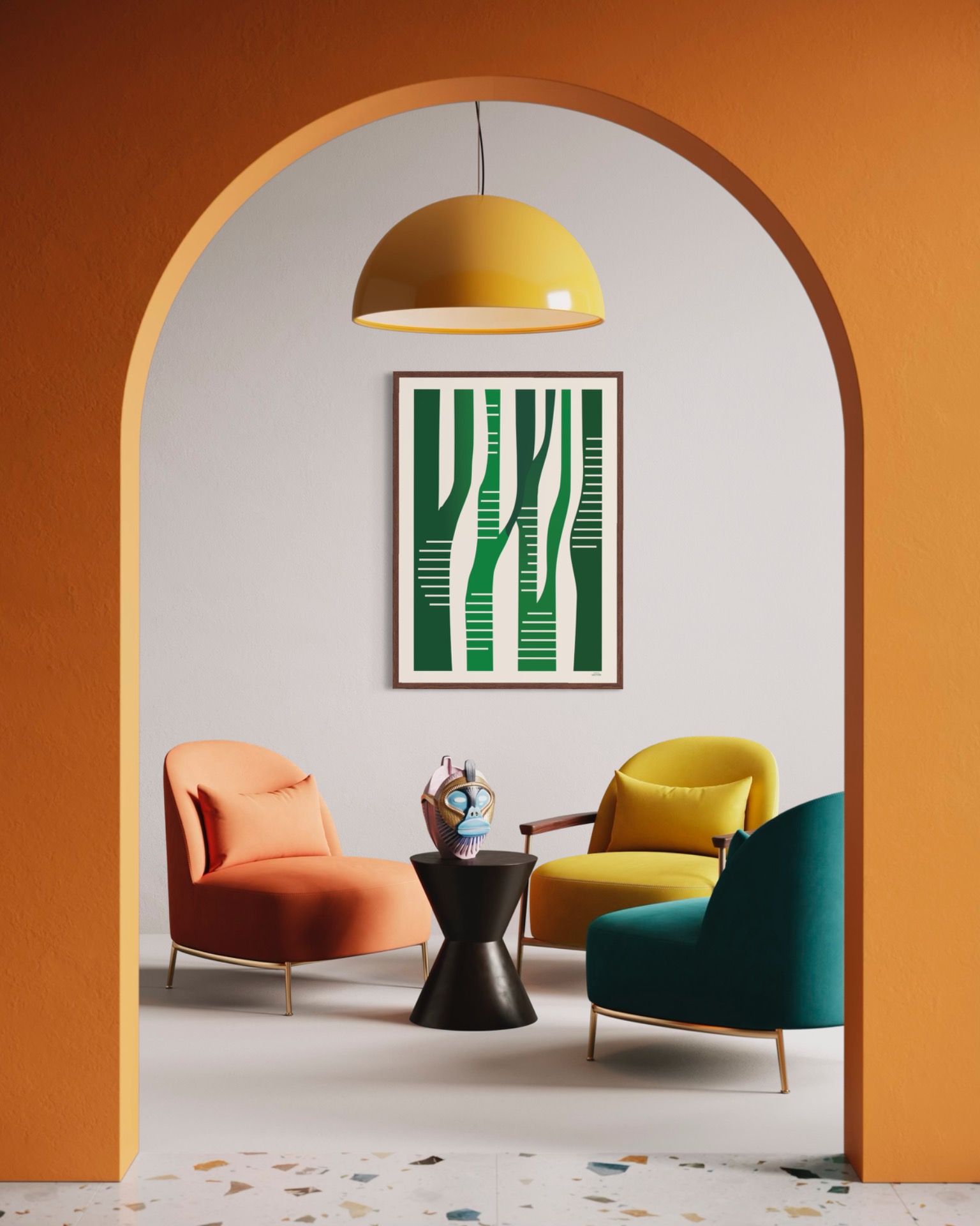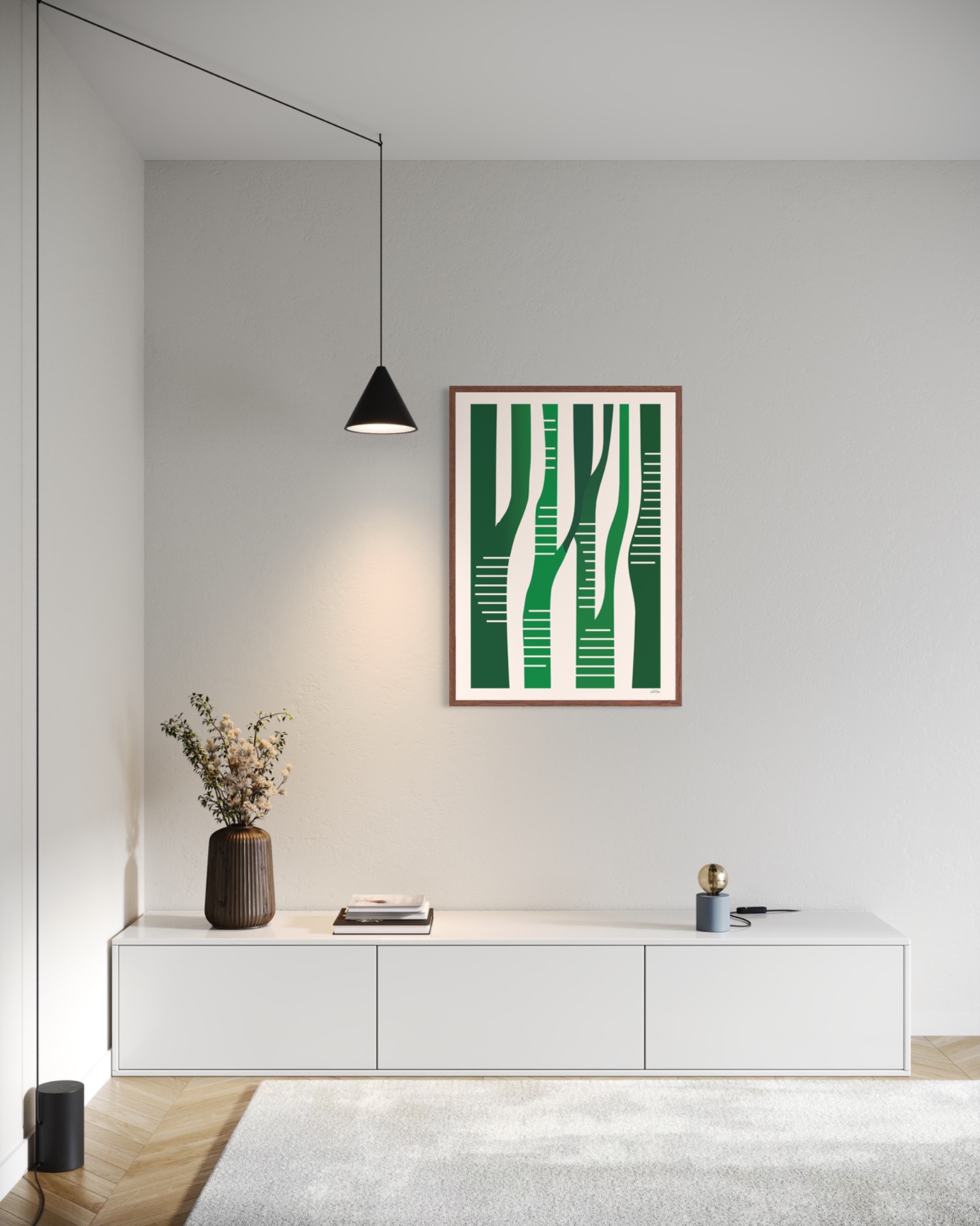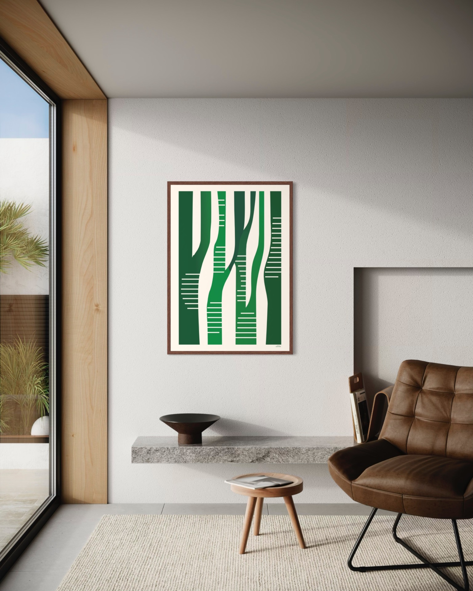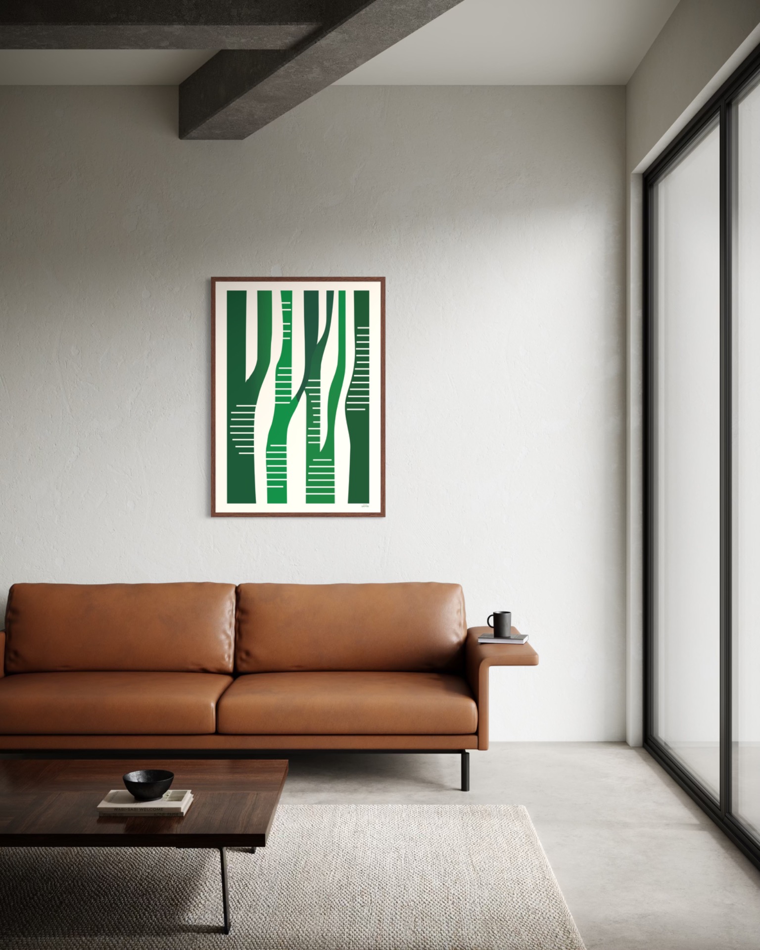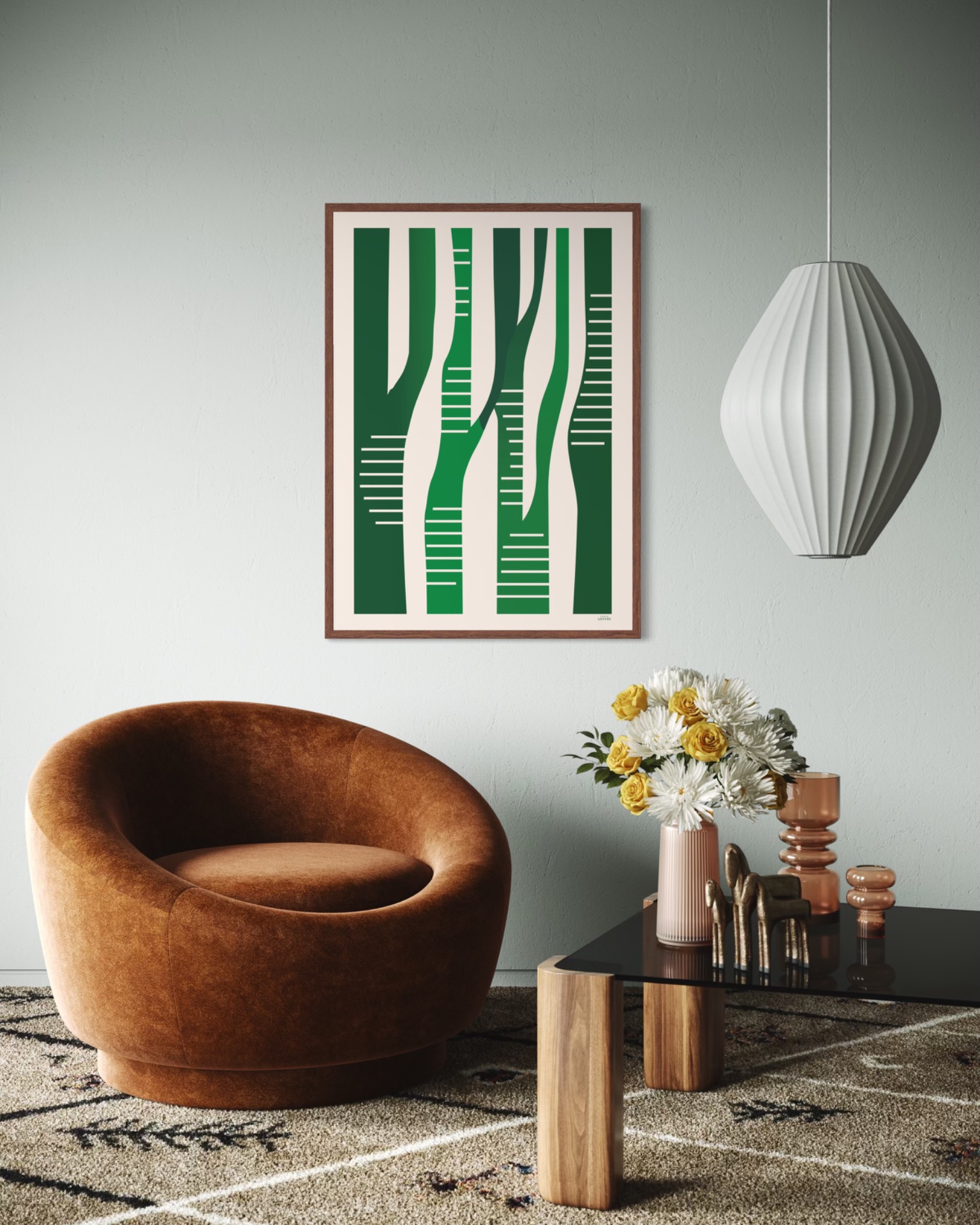 "The Wood" er min hyllest til naturen og er ment å fremkalle følelsen av å bevege seg mellom trær og simulerer skogens rytme og bevegelse. Plakaten er tegnet med mål om å passe inn i et minimalistisk interiør med myke linjer og grønne nyanser skaper en rolig balanse mellom natur og form