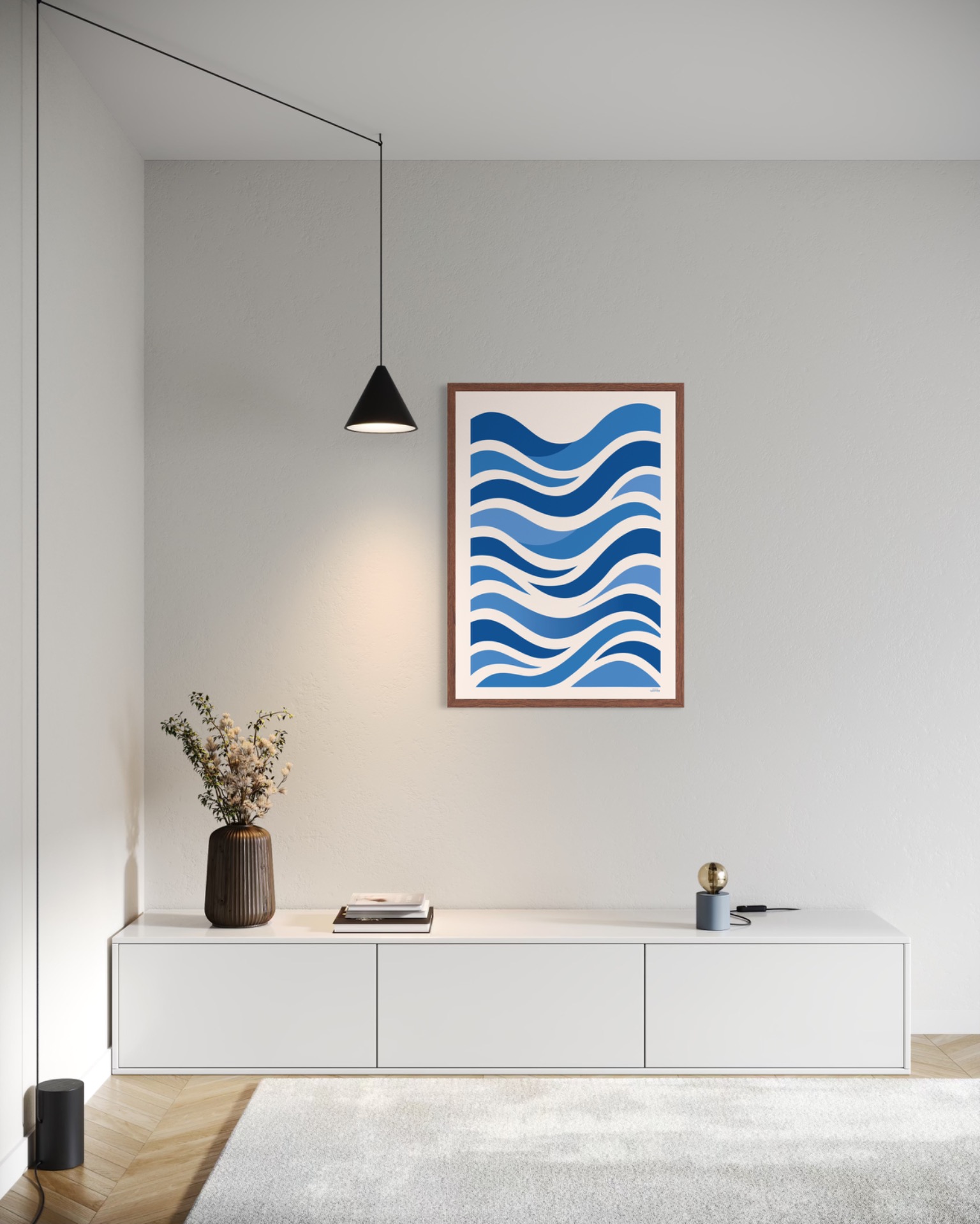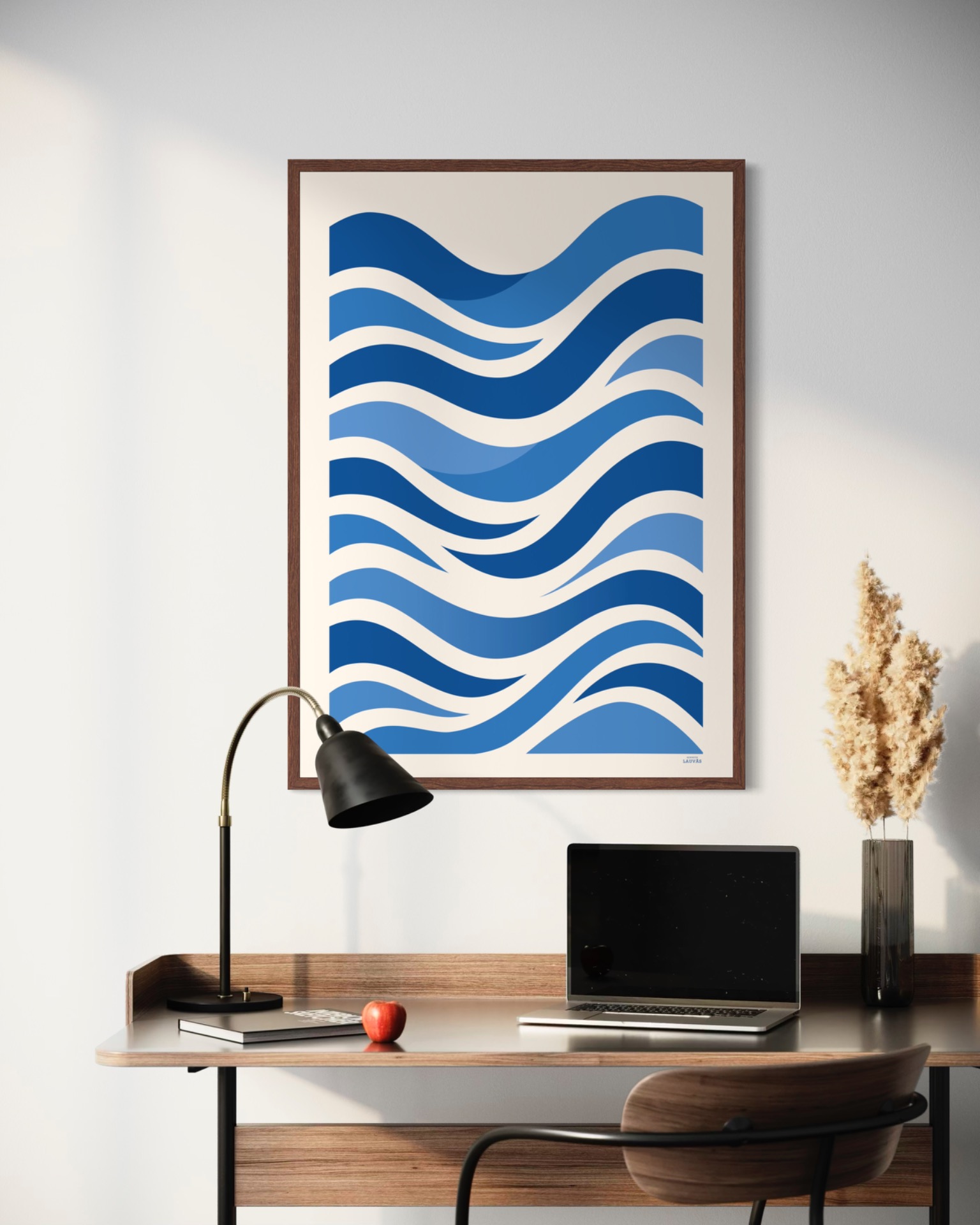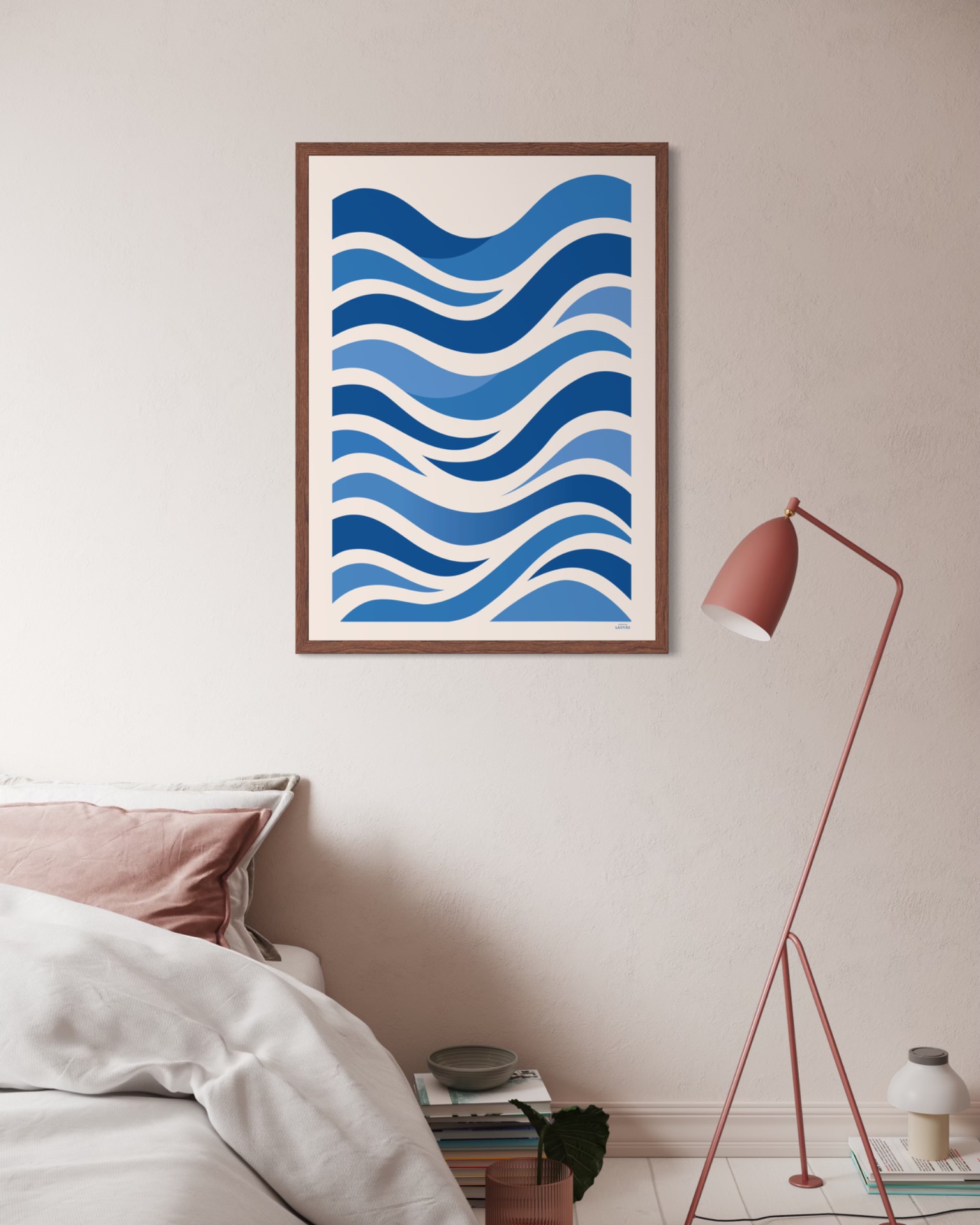 "Wave" er et grafisk uttrykk for bevegelse og harmoni – inspirert av den kontinuerlige flyten i naturen. Målet er å gi motivet en dynamisk karakter, og samtidig gi følelse av ro og balanse med myke linjer i ulike blåtoner. Plakaten passer perfekt i moderne og minimalistiske interiør, og bringer inn et snev av naturens flyt i rommet.