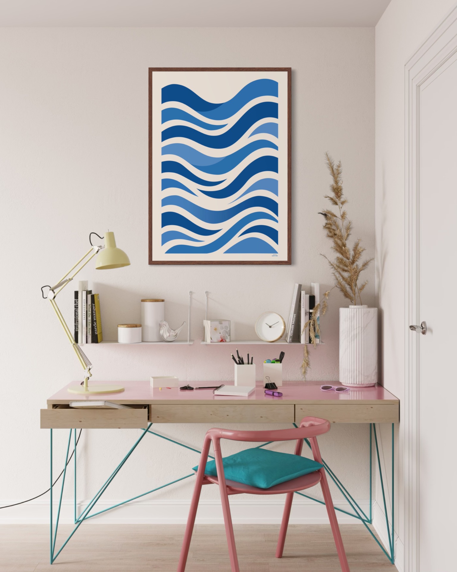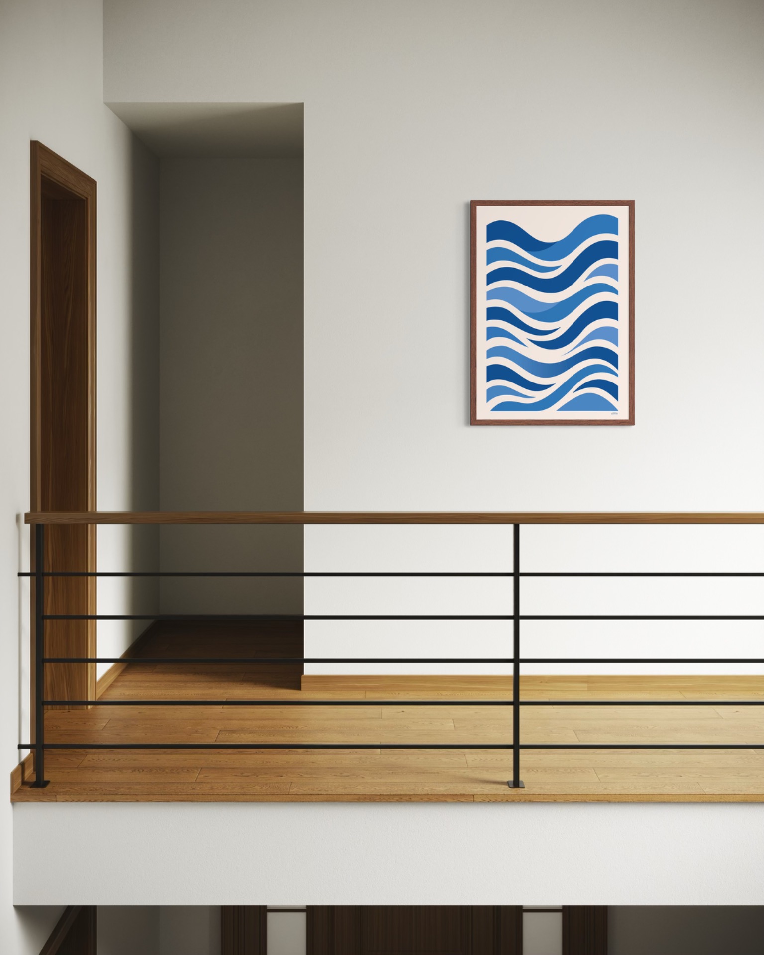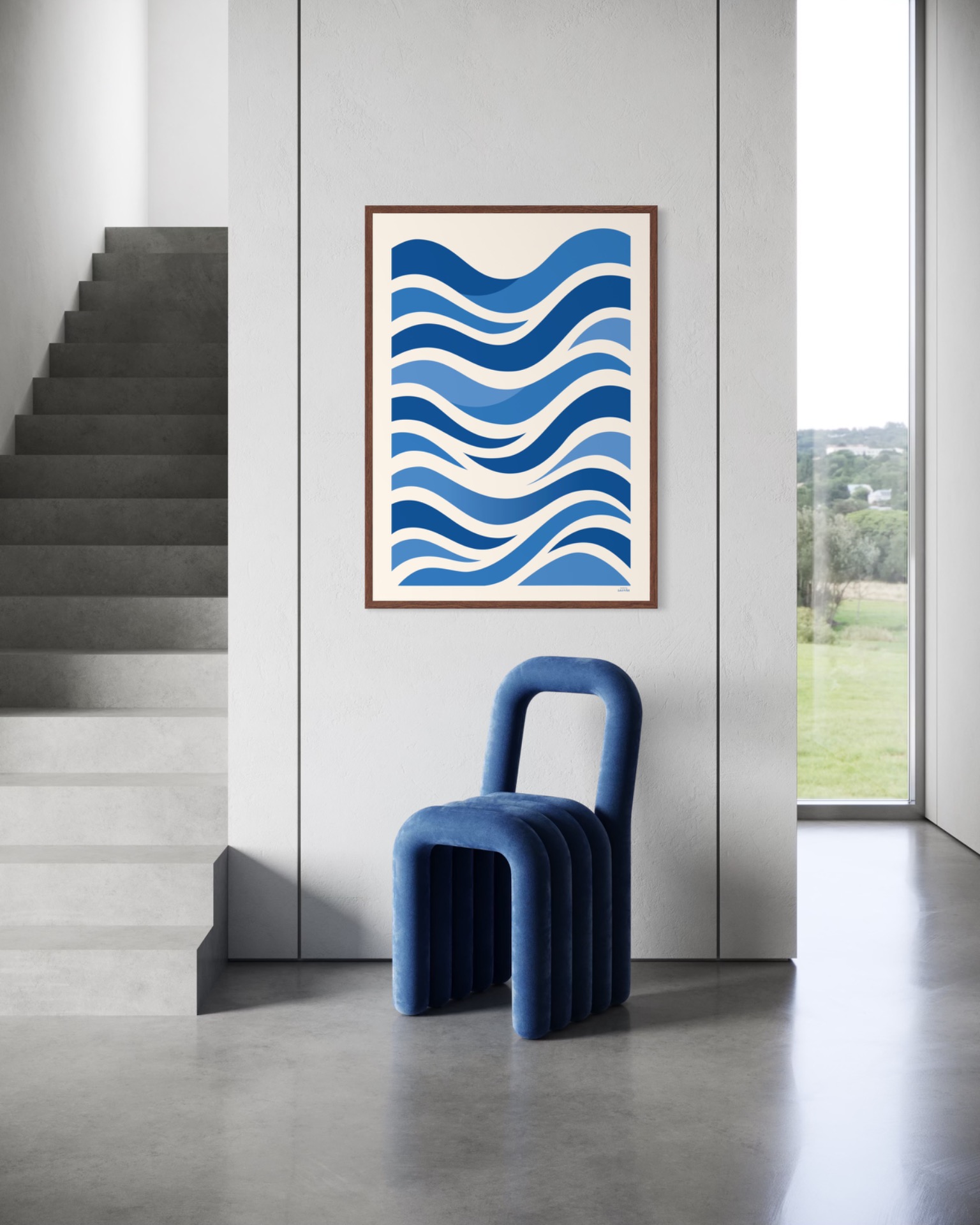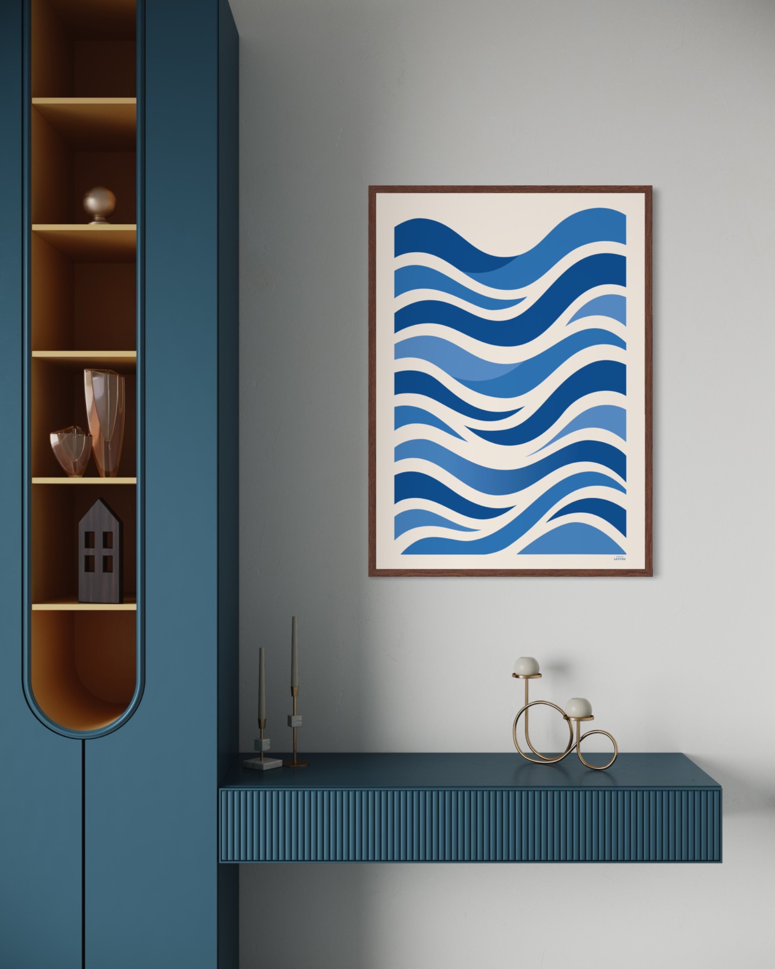 "Wave" er et grafisk uttrykk for bevegelse og harmoni – inspirert av den kontinuerlige flyten i naturen. Målet er å gi motivet en dynamisk karakter, og samtidig gi følelse av ro og balanse med myke linjer i ulike blåtoner. Plakaten passer perfekt i moderne og minimalistiske interiør, og bringer inn et snev av naturens flyt i rommet.